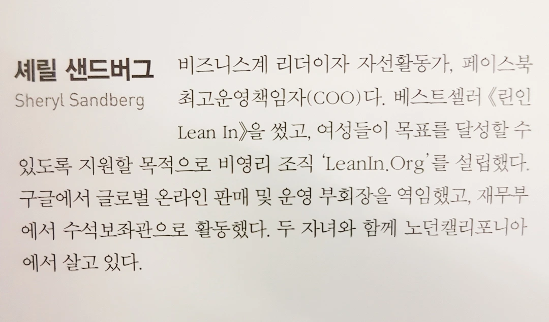 저자소개에 페이스북 최고경영자라는 한줄 빼고는 "린 인" 저자라는 것을 더 내세웠다. 어쩌면 많은 사람이 이름만으로 어느정도 그 인지도가 확보되었든지 혹은 소제목이 역경에 맞서고, 회복탄성을 키우며, 삶의 기쁨을 찾는 법이기 때문 일 수도 있다. 페이스북 이야기가 아닐 수도 있다는 곳이다. 바로 그녀의 삶인 것이다.