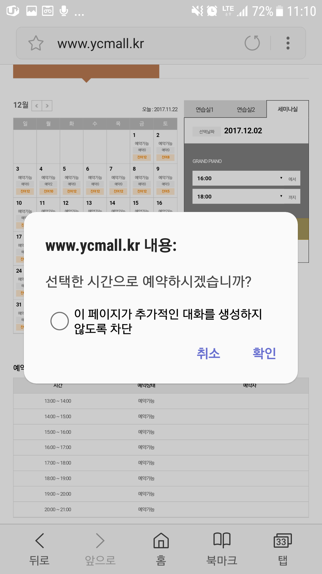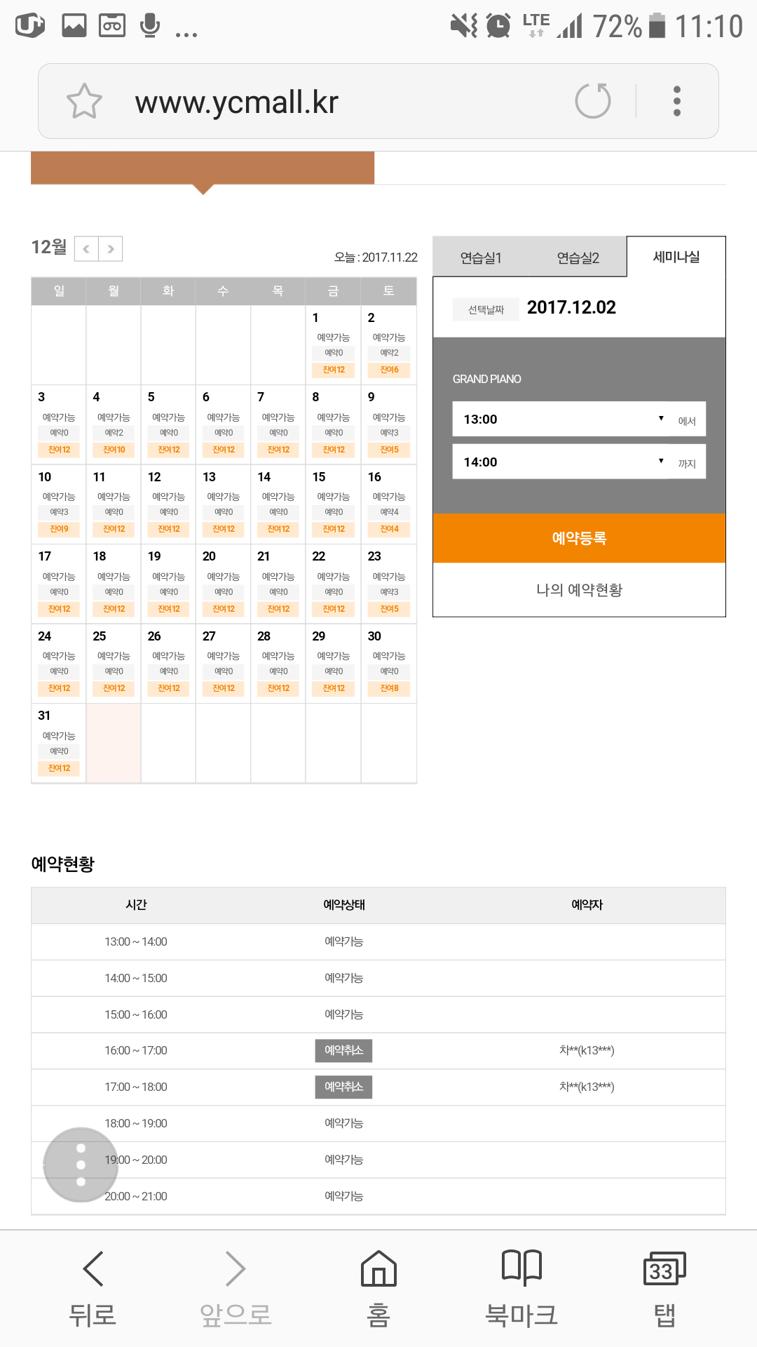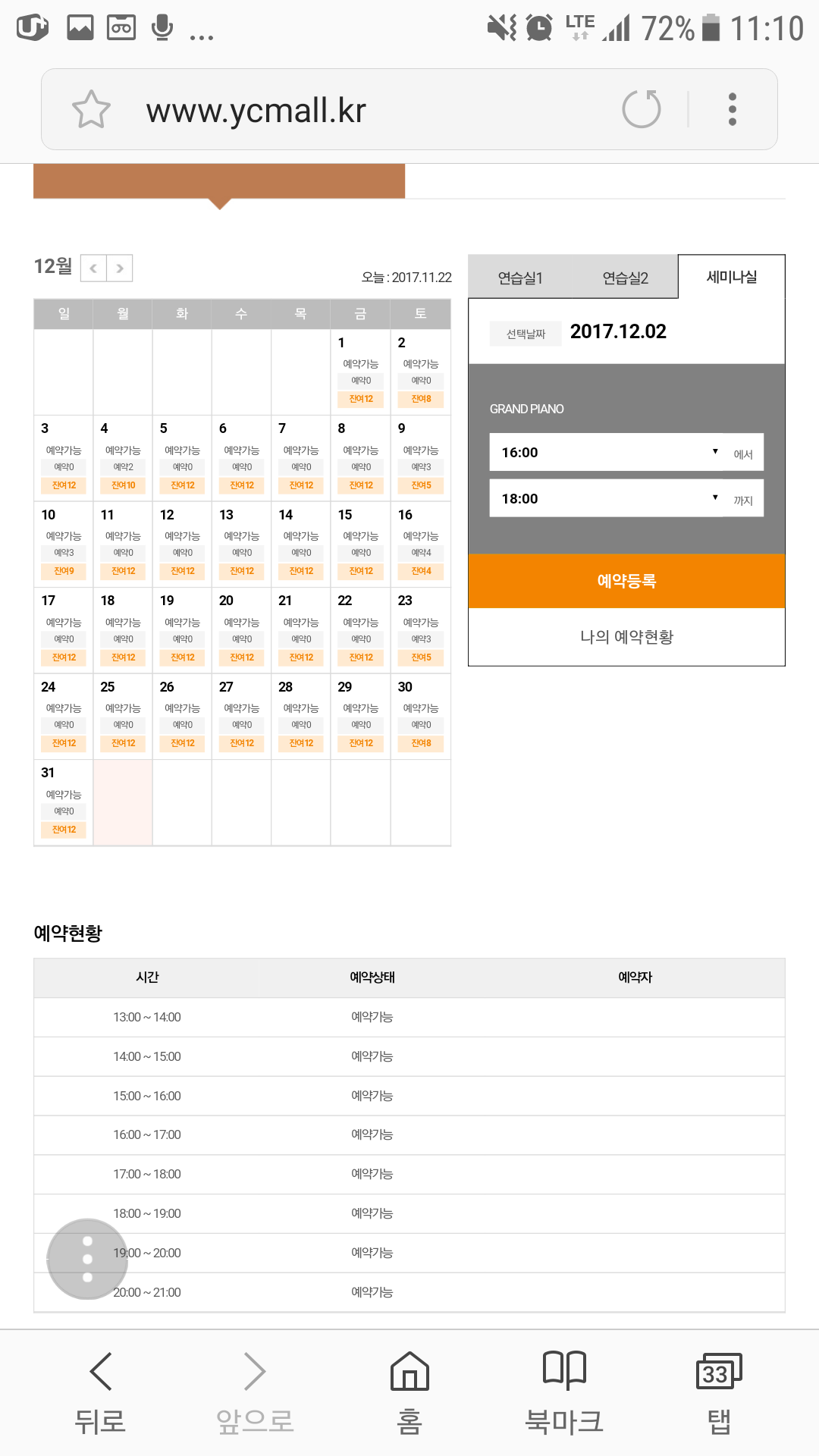 3.연습실1, 연습실2, 세미나실을 날짜별로 예약이 가능하다. 예약을 누리면 회원 가입은 필수다.