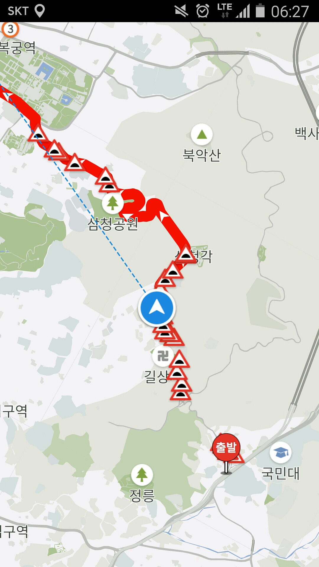 그럼 티맵은 어쩔까? 신기하게도 택시아저씨들이 선호하는 신호없는 삼청터널 길을 알려준다. 내가 원하던 길이다. 주중에 이 길은 몰라도 주말 이 시각에는 이 길이 맞지 않을까 생각해 본다.