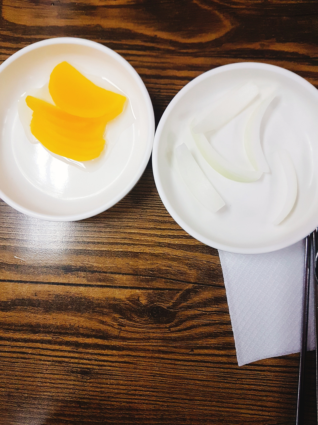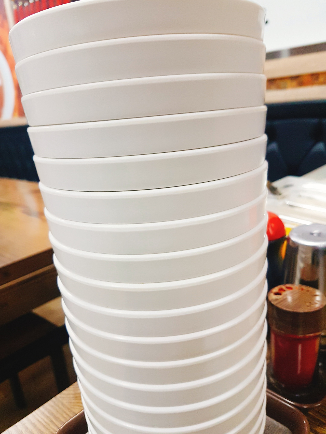 앞접시가 산처럼 쌓여있는 것이 특징이다.