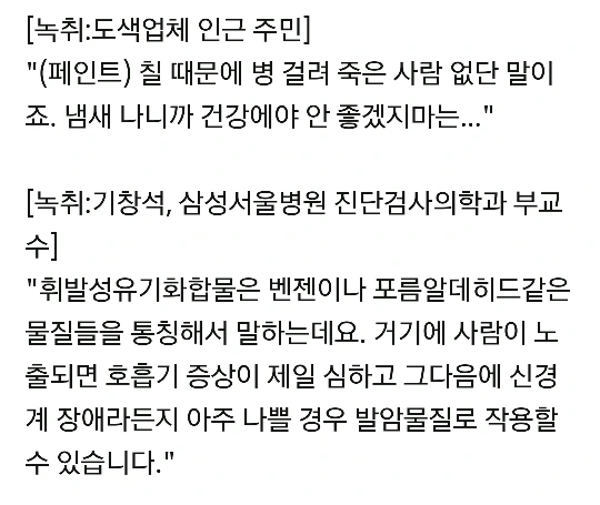 [삼성서울병원 진단검사의학과 부교수] "휘발성유기화합물은 벤젠이나 포름알데히드같은 물질들을 통칭해서 말하는데요. 거기에 사람이 노출되면 호흡기 증상이 제일 심하고 그다음에 신경계 장애라든지 아주 나쁠 경우 발암물질로 작용할 수 있습니다."