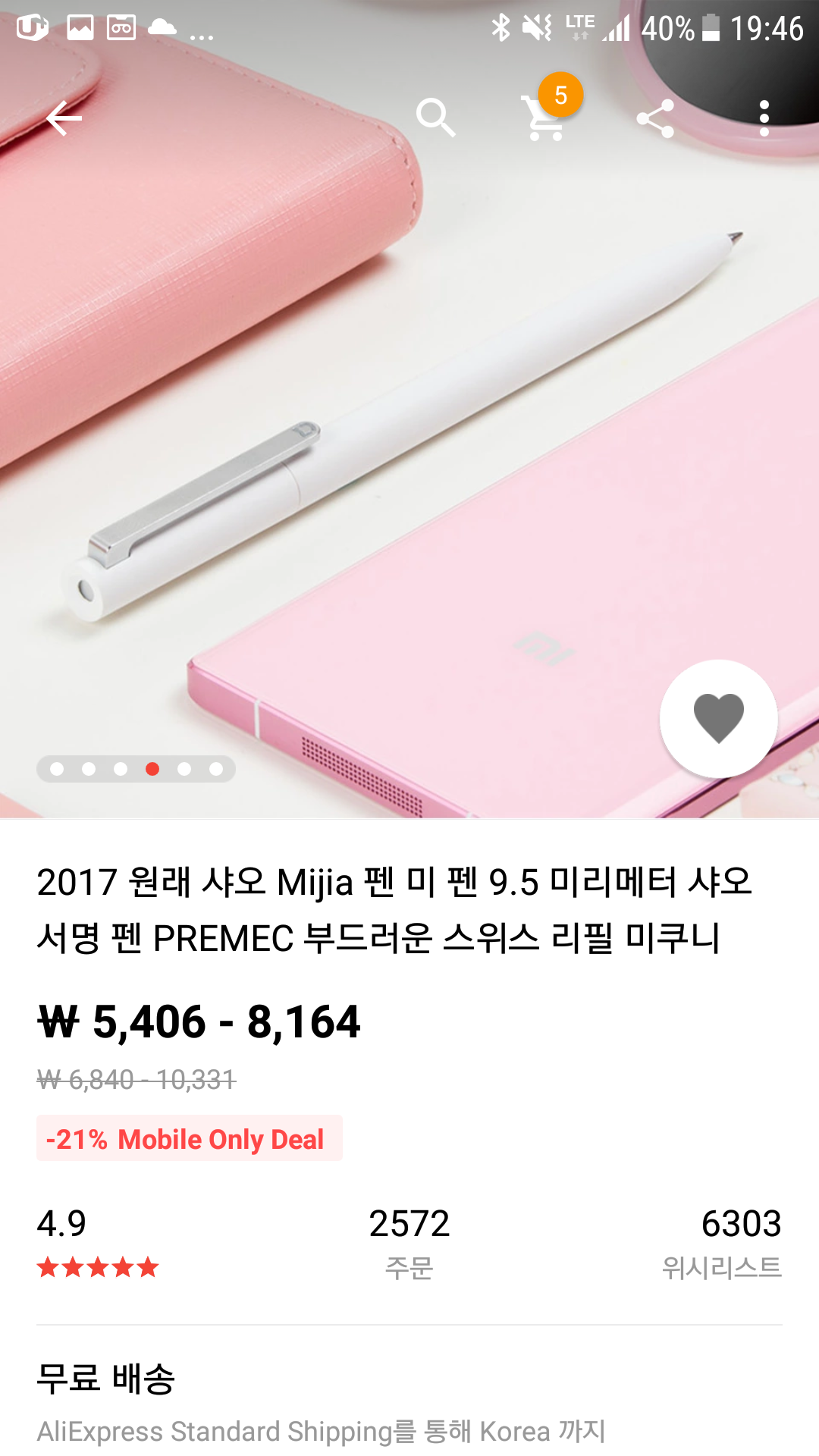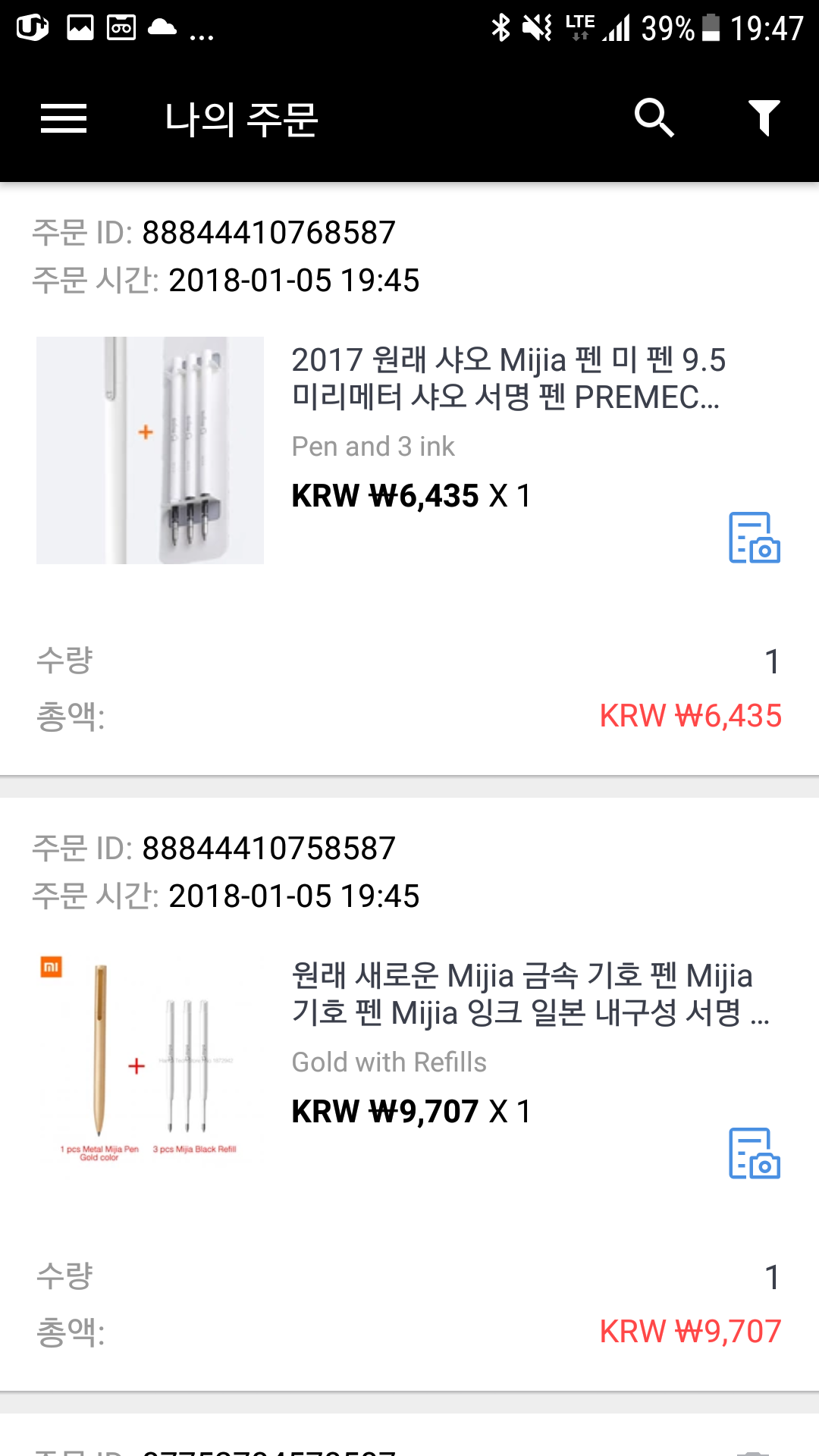 미펜의 가격들을 비교해 보고 흰색과 황금색을 주문한다.