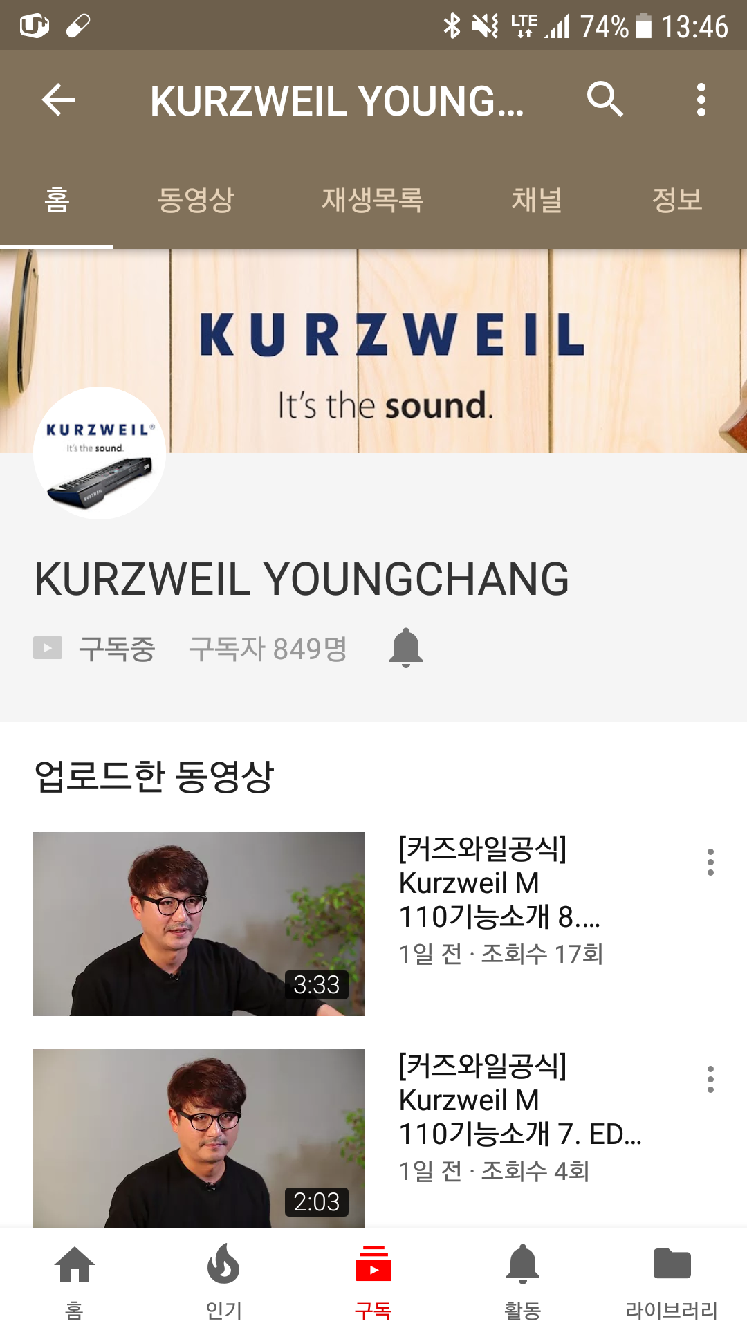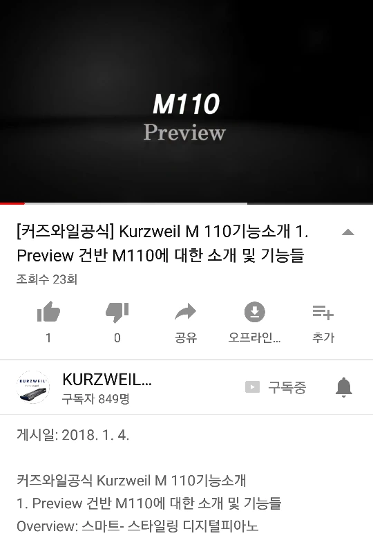 유튜브의 알람이 왔다. 디지털피아노 M110 에 대한 기능소개이다. 구독하고 있는 커즈와일 영창 채널이다.