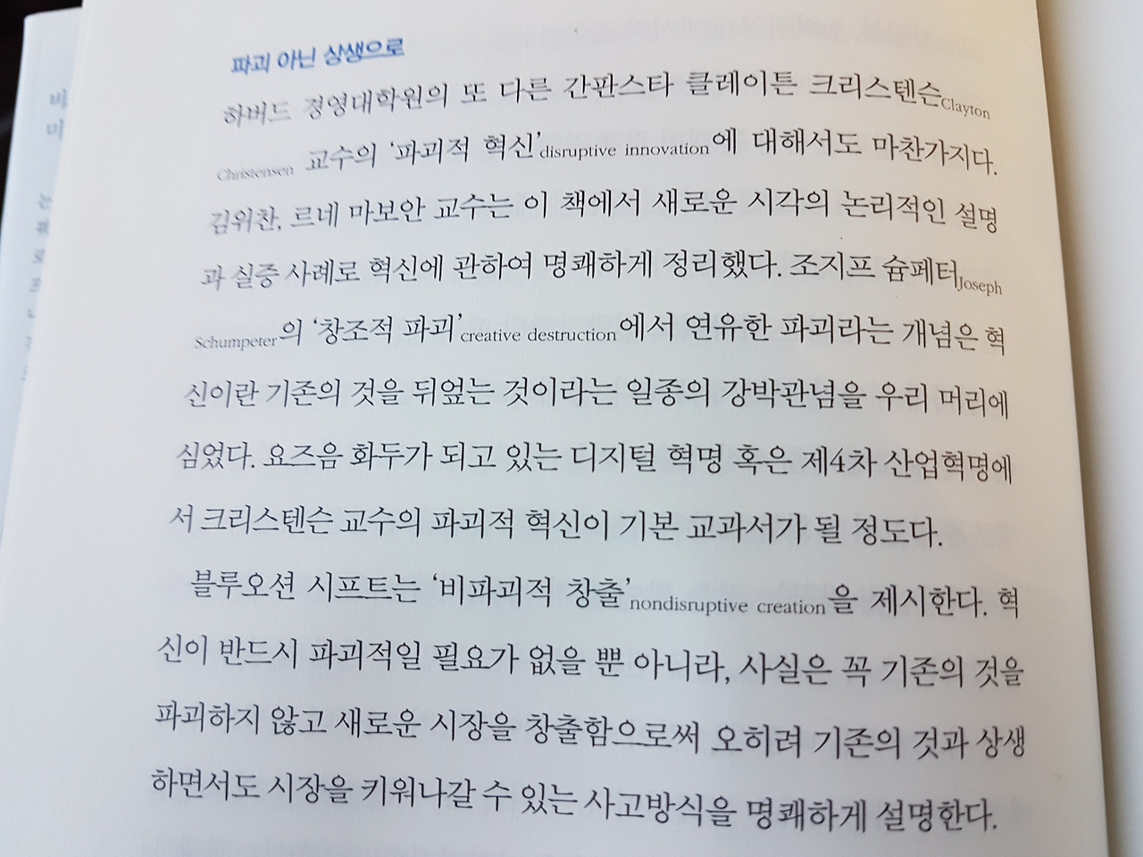 P16 혁신이 반드시 파괴적인 필요가 없을 뿐 아니라, 사실은 꼭 기존의 것을 파괴하지 않고 새로운 시장을 창출함으로써 오히려 기존의 것과 상생하면서도 시잔을 키워나갈 수 있는 사고방식을 명쾌하게 설명한다.