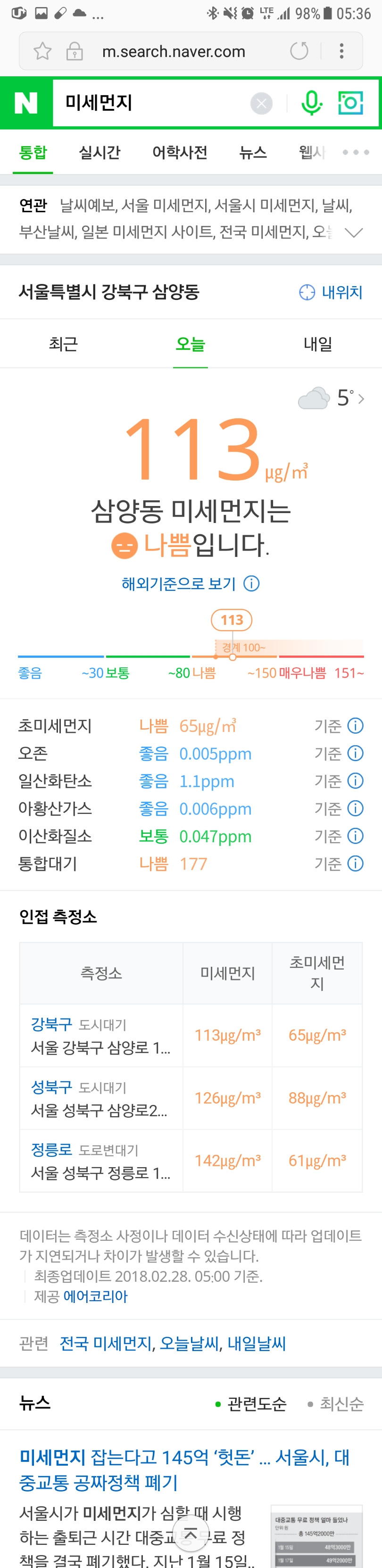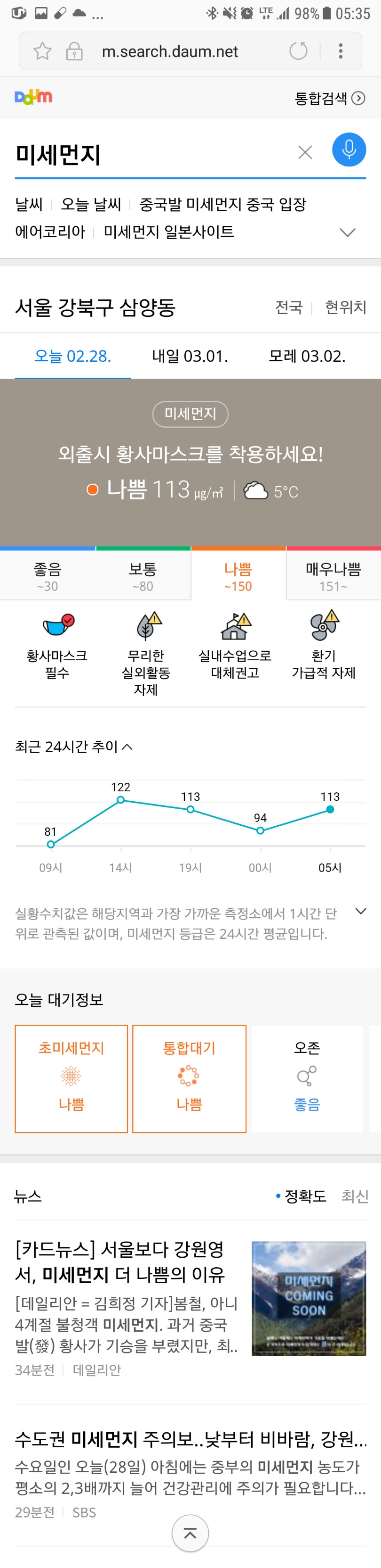 어제는 하도 미세먼지가 강해서 오늘도 마친가지러 미세먼질 찾아본다.