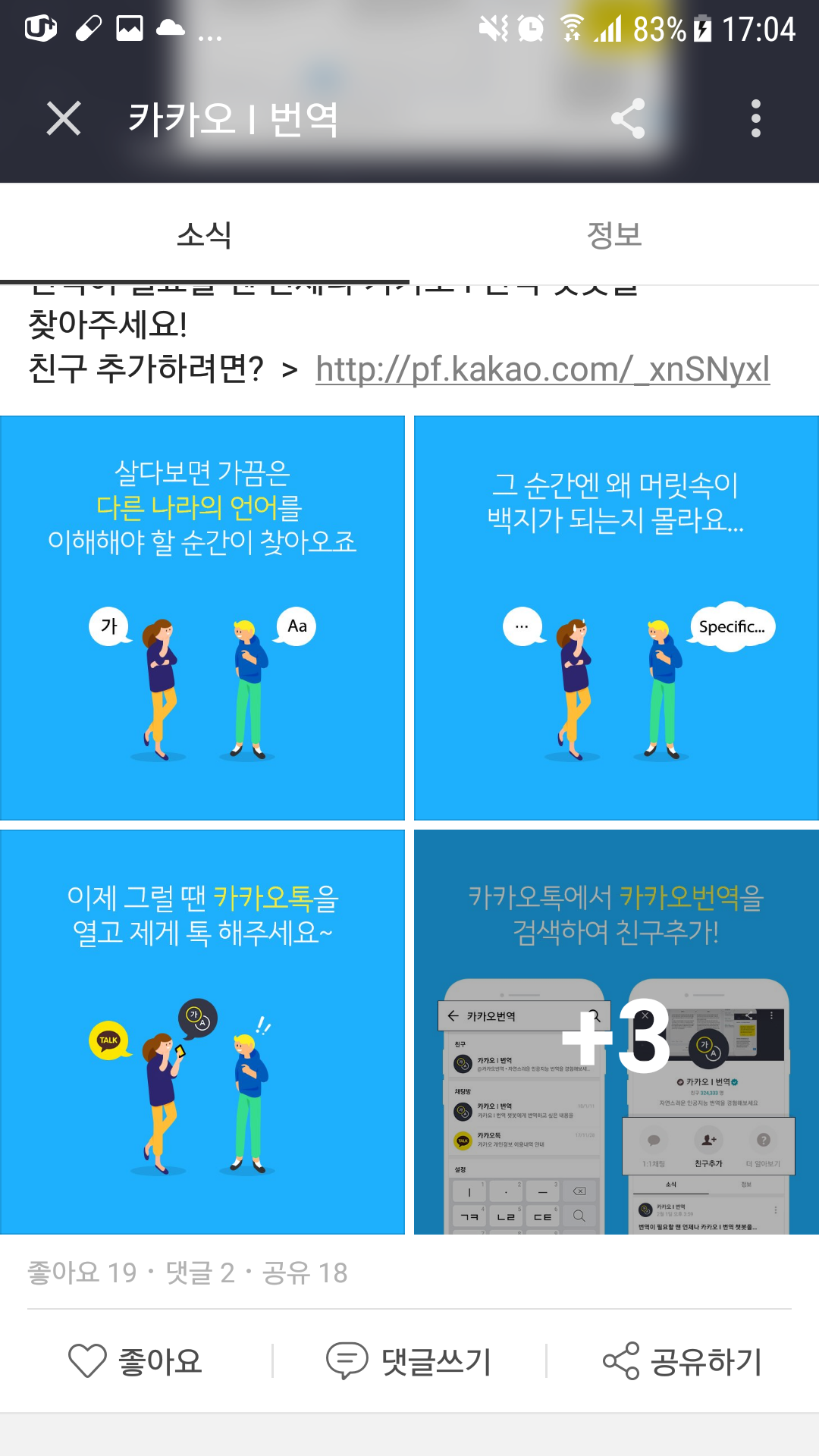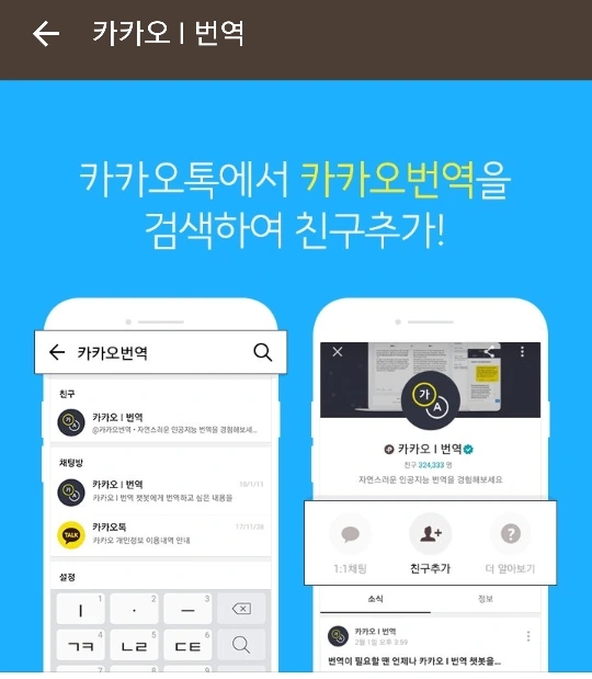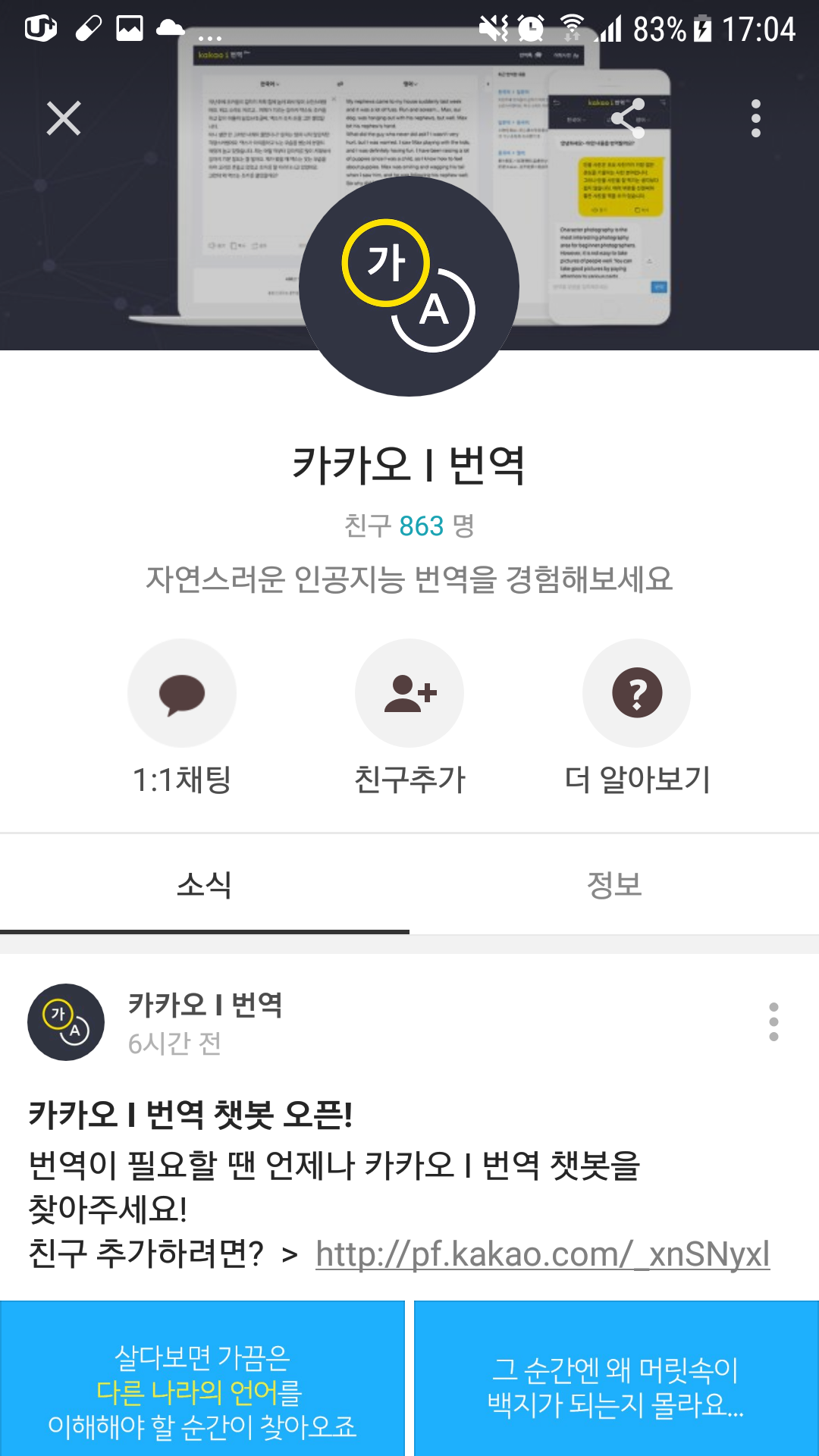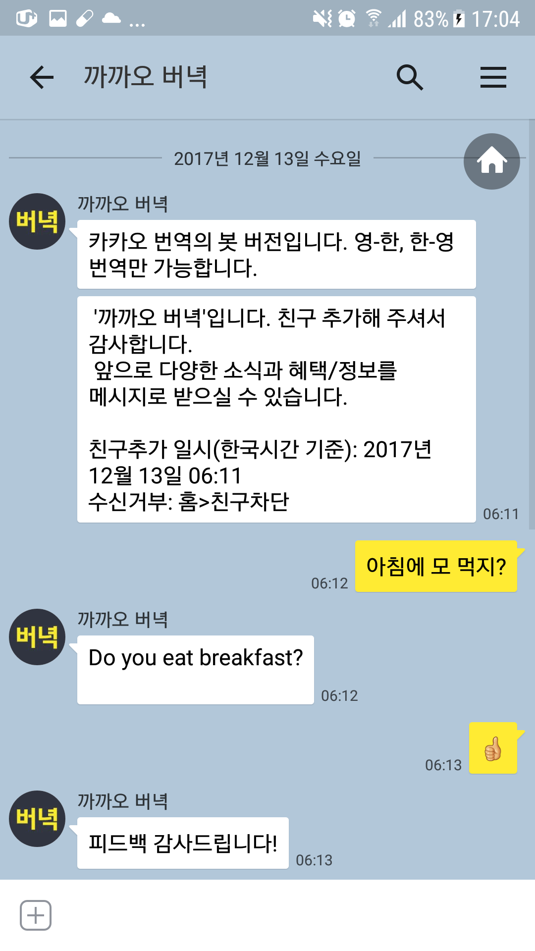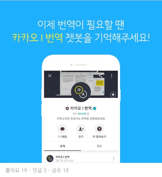 카카오톡,AI,까까오버녁,번역봇,샘플봇 | AI번역, 챗봇, 버녁 정식 서비스가 아니라고 하는 뚝딱 만든 샘플봇, 번역봇 서비스를 써 본다. 누군가의 소개 페북 누군가의 어떤 정보가 얼마나 유익함을 새삼 다시 맛본다. 그런면에서 컨텐츠 생산자 공유자, 중개자가 중요성을 다시 평가하게 된다. 물론 컨텐츠, 바로 정보의 품질과 정보의 나와의 연관성이 가장 높을 것이다. 카카오대표의 정보의 공유, 공유