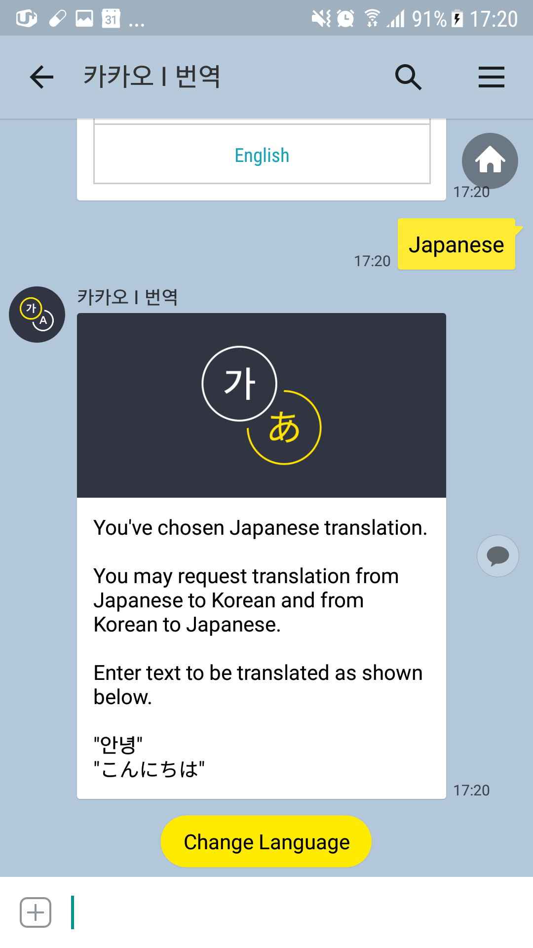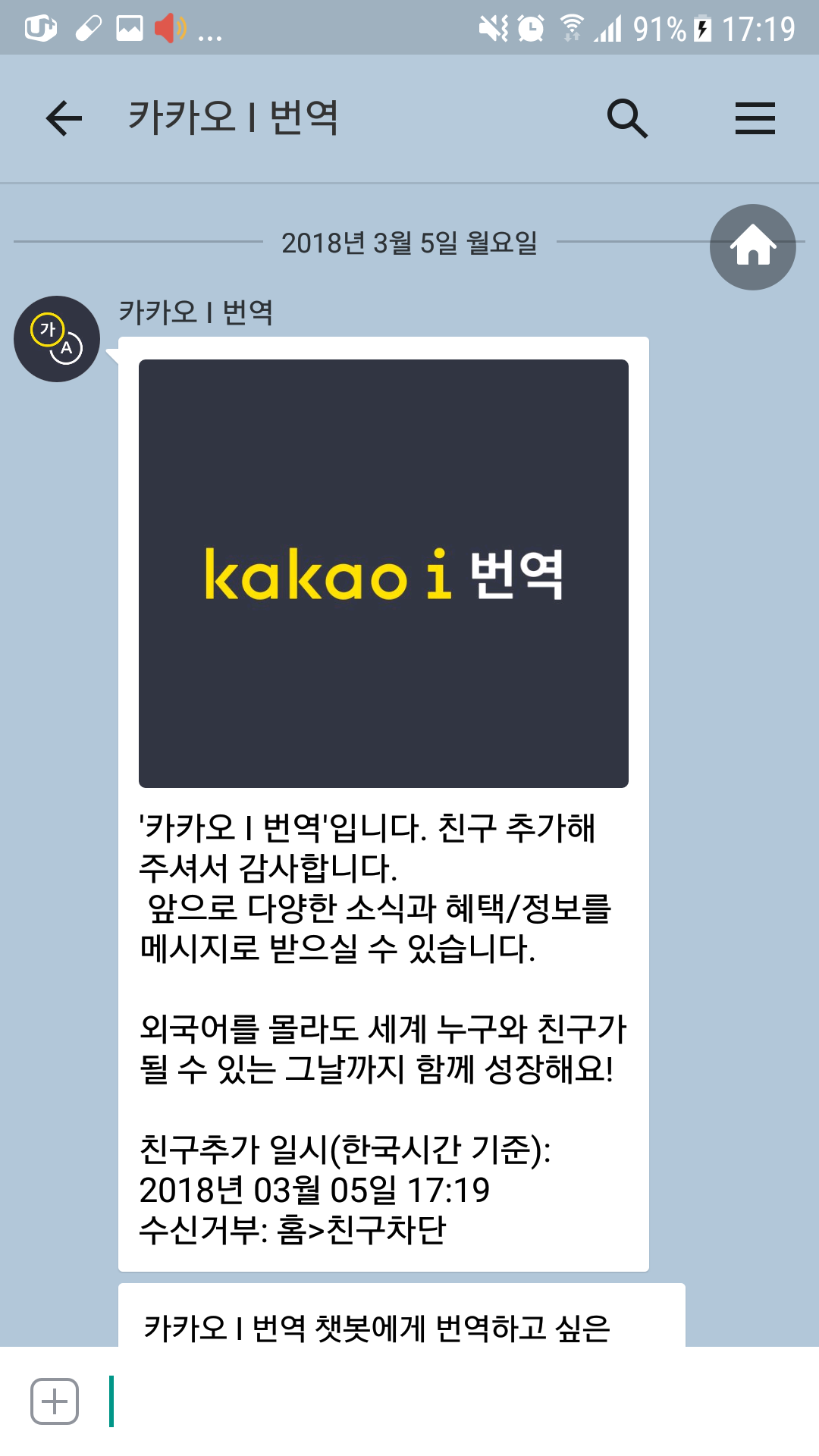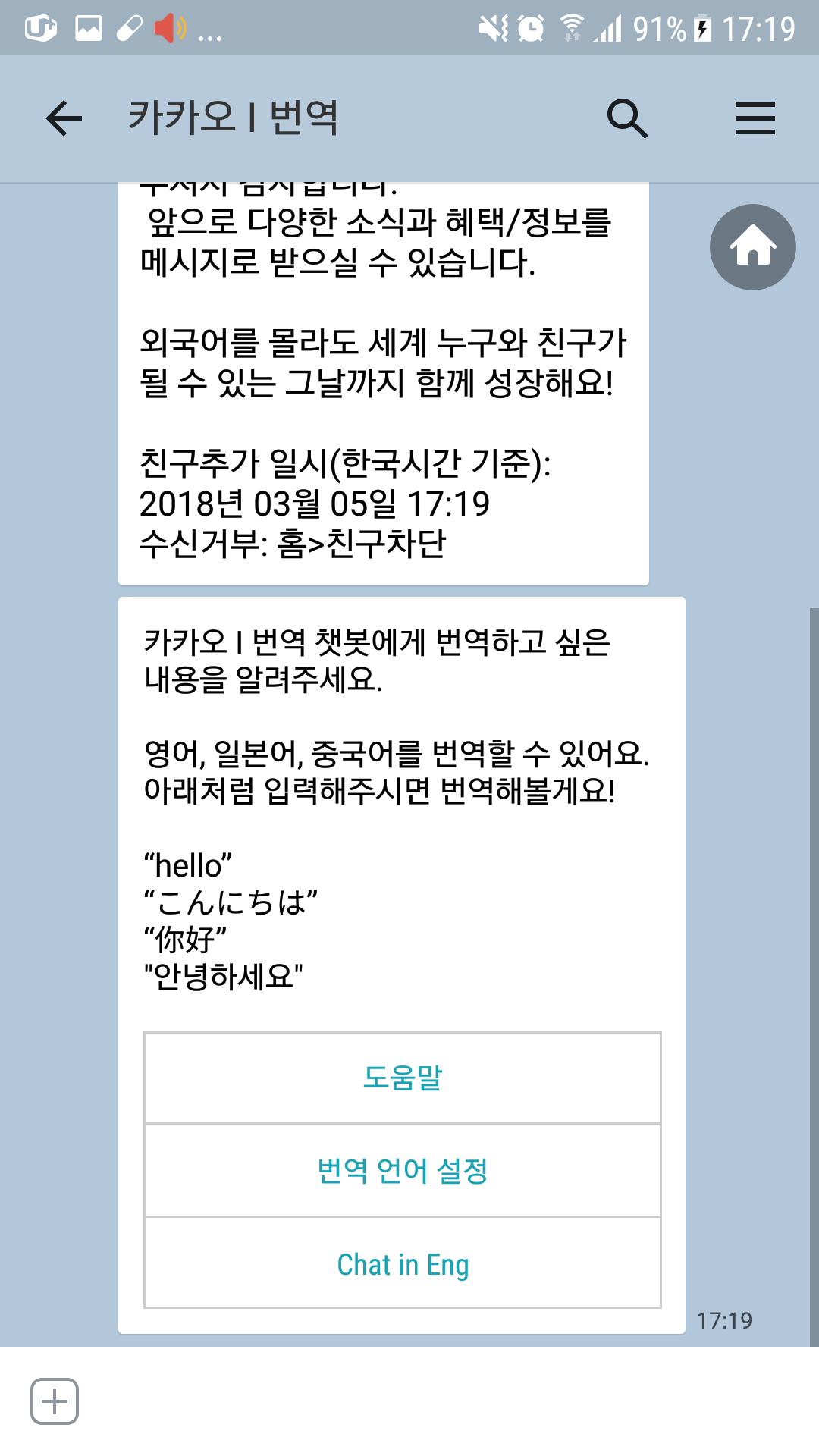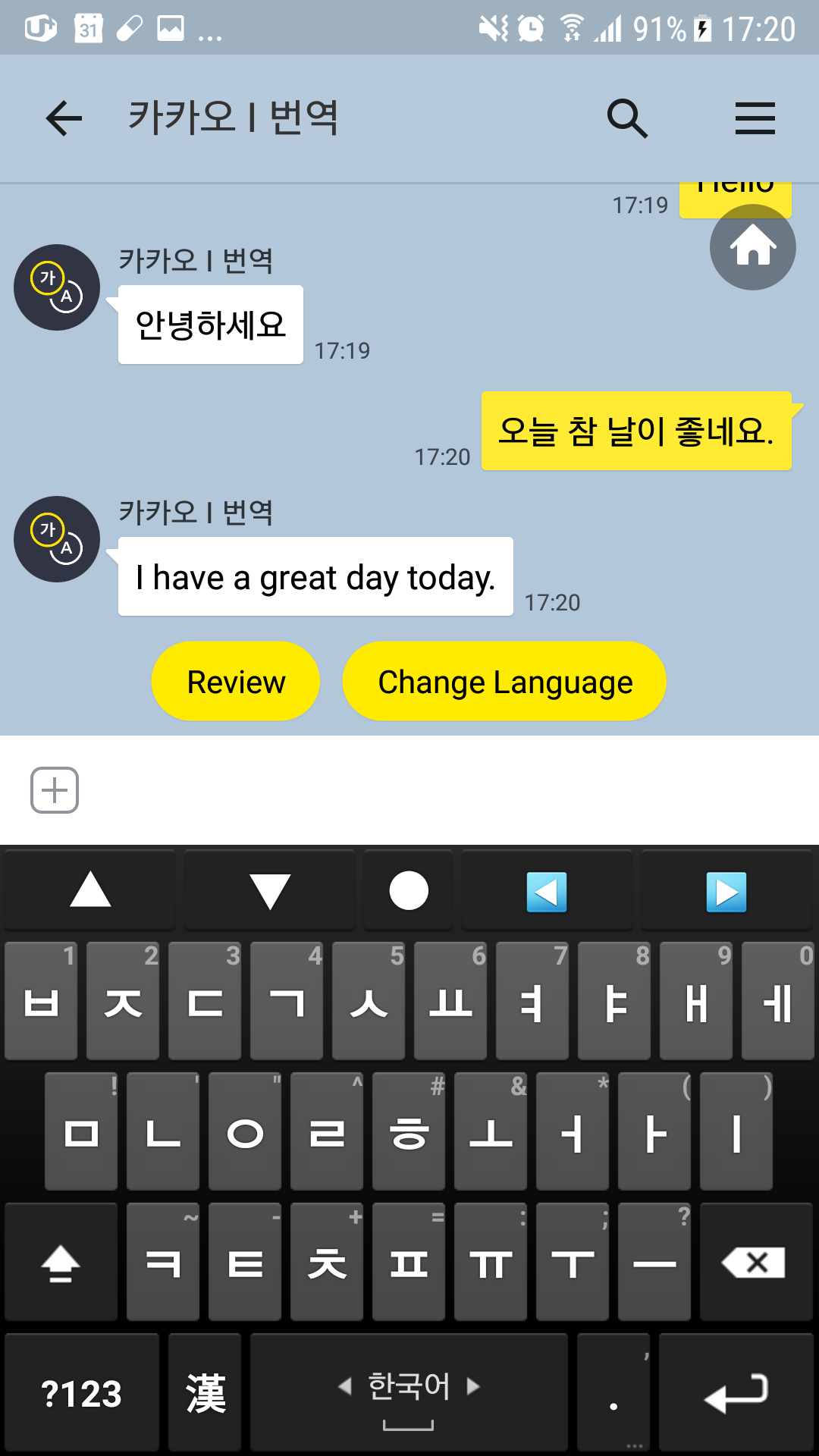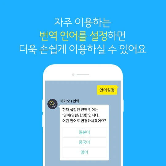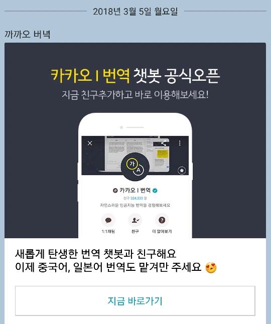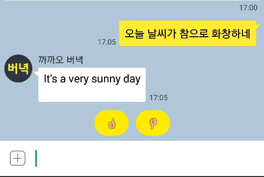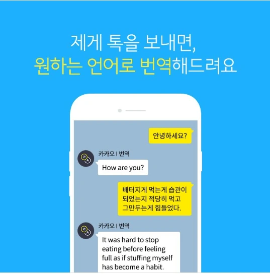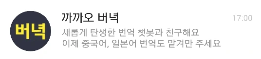 작년 12월 까까오 버녁 서비스가 베타서비스로 진행하다가 오늘 카카오 번역 챗봇으로 오픈했다.
