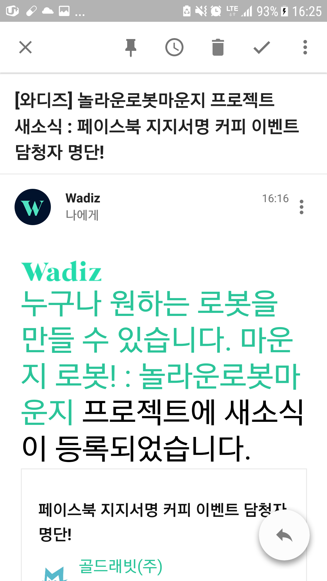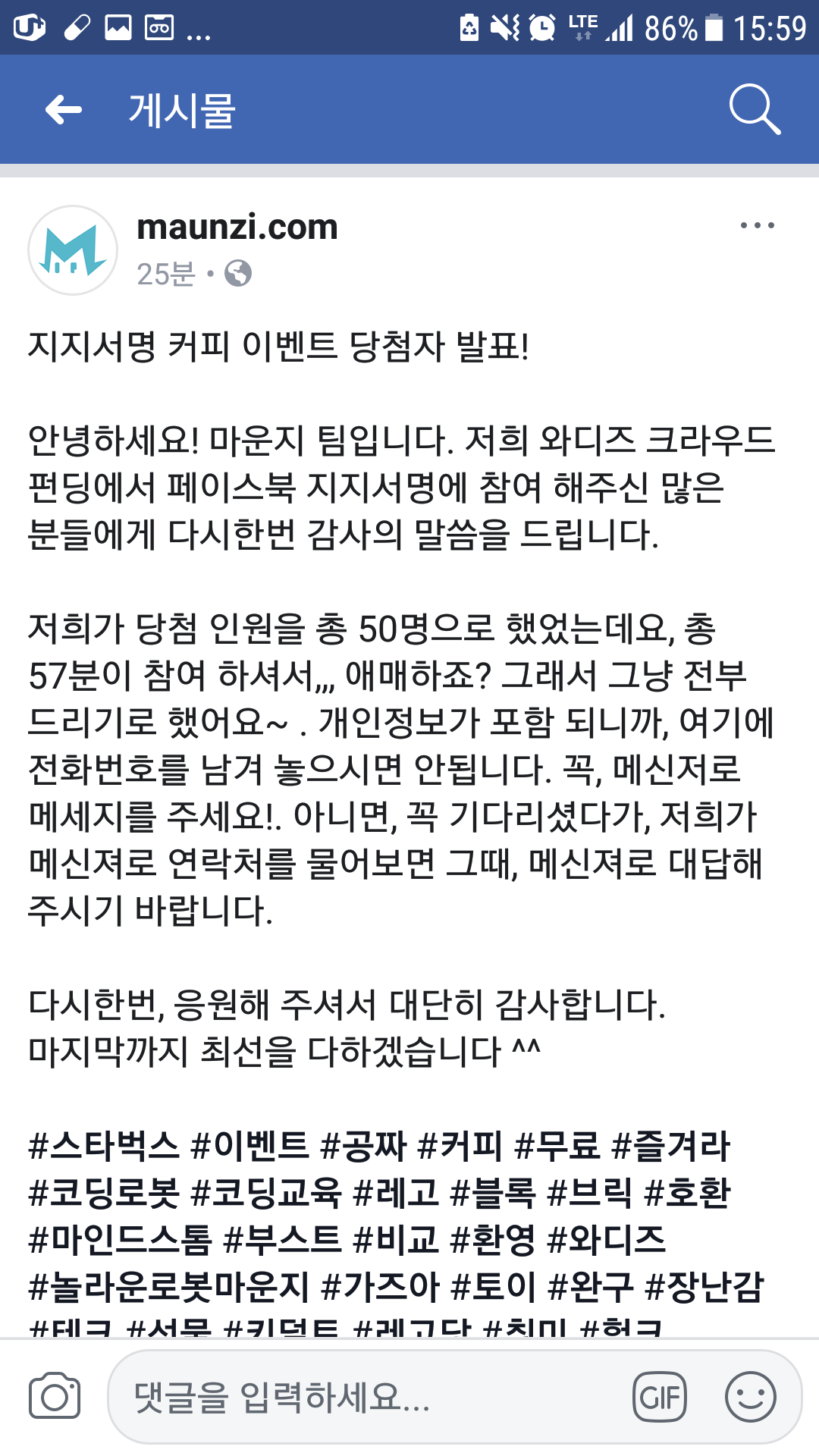 와디즈 마운즈로봇을 지지서명했는데, 50명 뽑는데 52명이 지지했다고 하여 지지서명한 모든사람에게 경품을 준다고 한다.