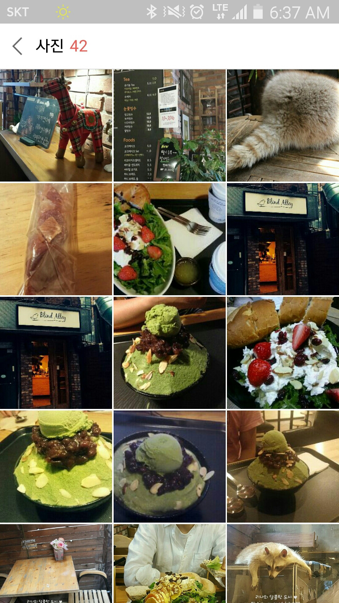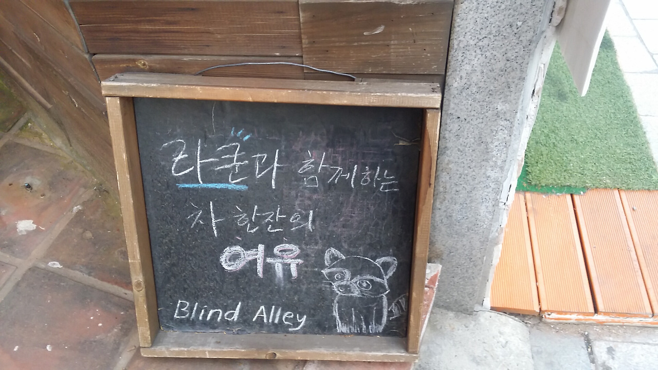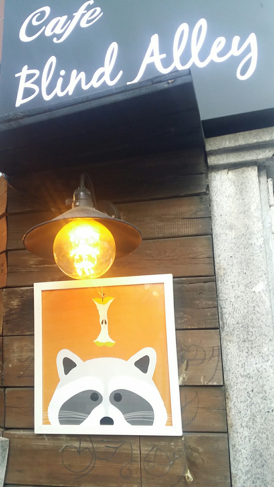 보통 매운 자극으로 불을 지피면, 반드시 속을 달래주어야 한다. 그래서 아이스크림이나 팥빙수가 다음 코스다. 이삼년 전 부터 여름 유묭세를 탔던 눈꽃빙수가 있다. 그래서 누군가의 추천으로 찾아갔던 카페가 블라인드 앨리다. 시원함을 대변하는 곳이였는게 언젠가부터 너구리 카페라는 컨셉으로 전환되었다.