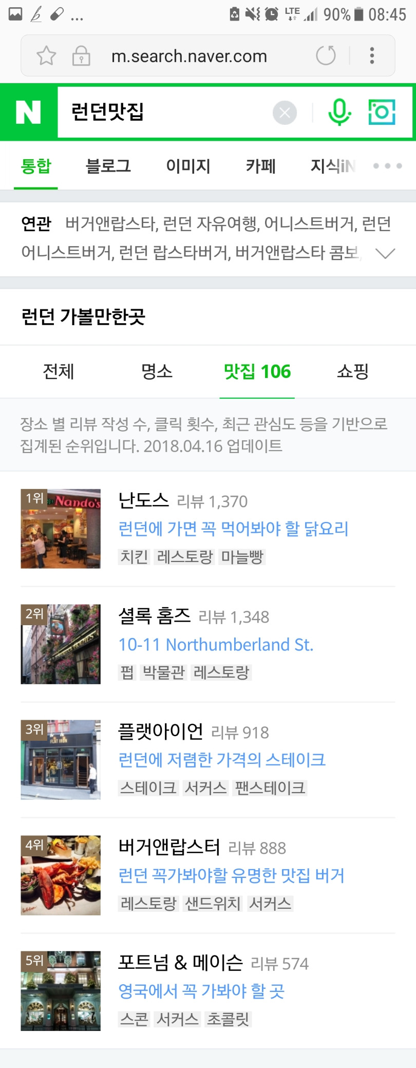 런던 맛집을 네이버에 검색하니 3번째로 나온다.