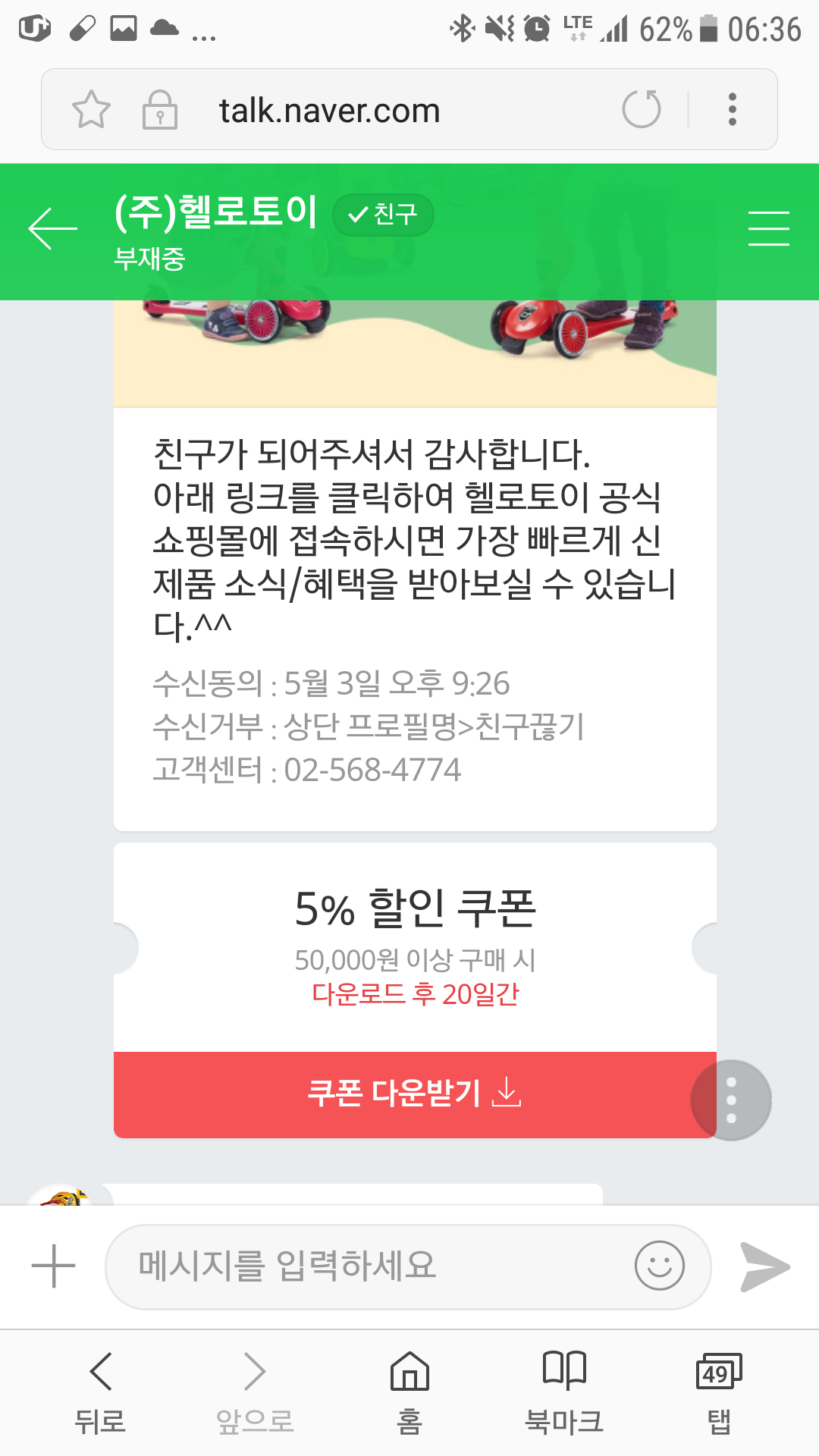 그러다가 실제로 니코RC카 직수입 원천업체를 찾았다. 이곳에서 수압해서 11번가 등으로도 보내고, 직접 팔기도 하는 것이였다. 그러니 가격 경쟁력도 있었다. 분명, 가격이 착했다. 그리고 톡톡친구 추가 시 첫구매에 한하여 5만원 이상이면 5% 할인쿠폰도 챙겼다. 게다가 무료배송이였다.