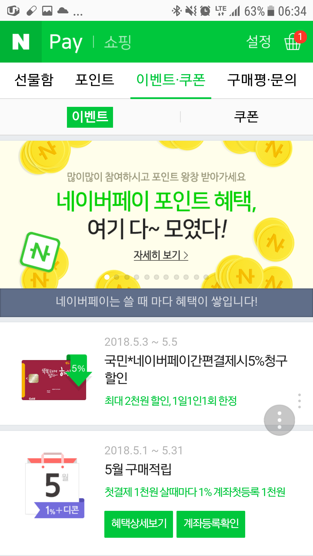 최근 네이버페이에서 국민카드 5% 청구할인도 생각도 나고, 네이버쇼핑포인트가 적립되는 네이버페이가 가능한 곳을 찾아보았다.
