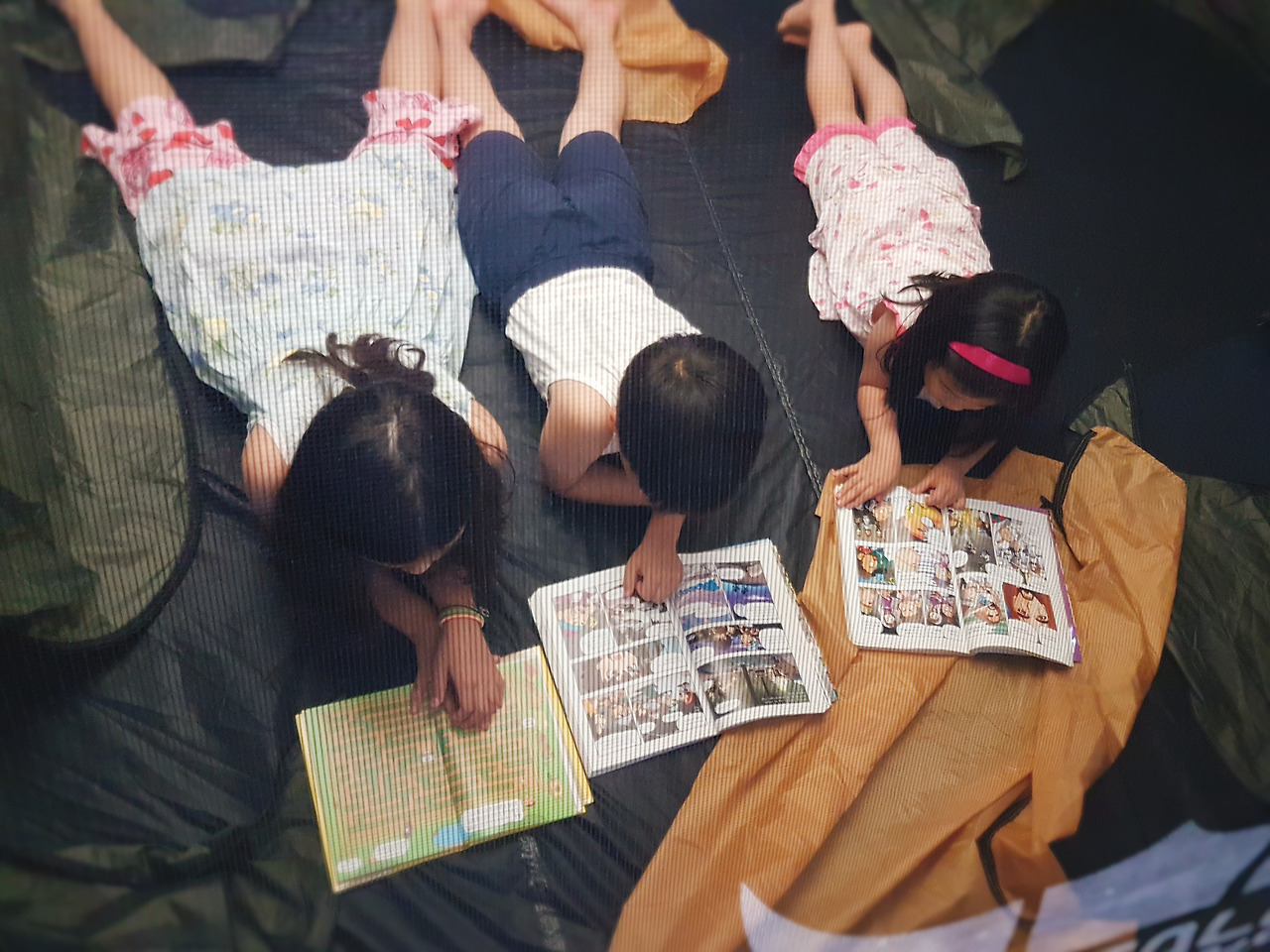 돗자리로는 날이 더워서 그늘막은 필수다. 나무그늘 등의 명당자리들도 있지만 그늘은 항시 움직이기 마련이다.