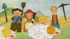 그제야 마을 사람들은 소년이 있는 언덕 위로 뛰어 올라온다, 늑대를 잡기 위에 손에는 낫과 쟁기를 들었다.