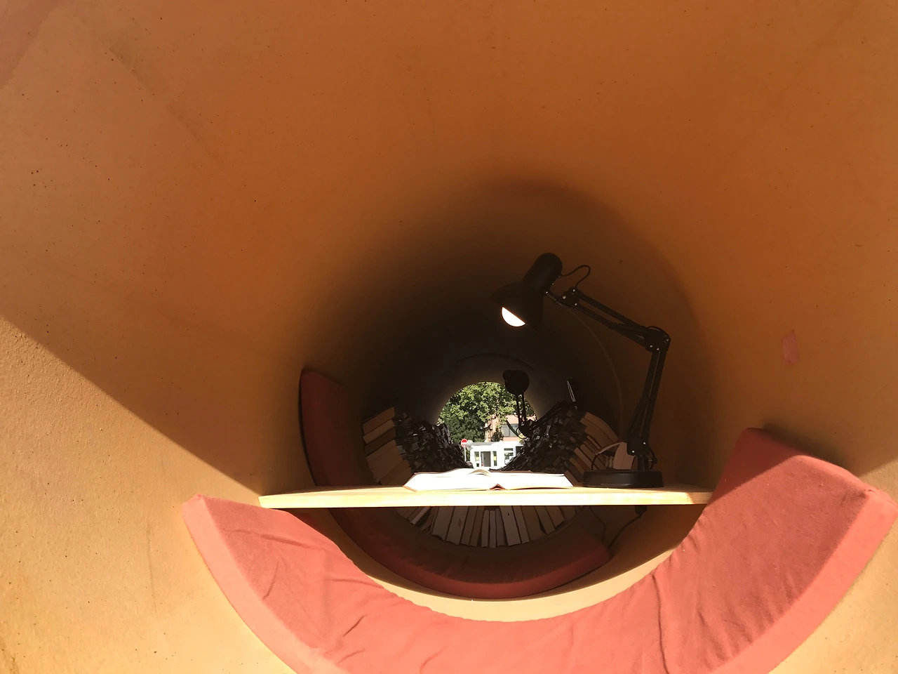 배수관이 책을 읽을 수 있는 공간으로 개조되었다. 난민들의 절박한 삶이 엿보인다. '배수관 아파트', 히와 케이 作, 카셀 도큐멘타 2017