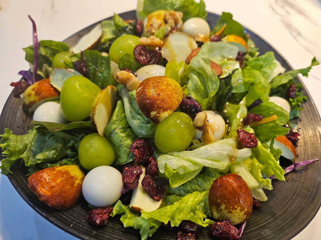 서둘러 동네 친한 언니에게 사과대추를 크게 한 봉지 담아 나눠 주었다. 며칠을 먹어도 사과대추는 끝이 나질 않았고, 나는 이걸 빠르고 맛있게 먹을 수 있을 방법을 약간의 고민 끝에 생각해 냈다. 양상추, 로메인, 적근대, 적양배추, 청치커리 , 당근, 양배추 구성으로 이루어진 샐러드채소믹스를 준비. 깐메추리알 양껏. 아이들이 좋아하는 샤인머스캣도 취향만큼. 냉장실에서 잠자고 있던 아몬드, 호두 약간. 새콤달콤한 크렌베리까지 장만해 둔 참이다. 오늘의 주인공 격인 사과대추도 대강 썰어 담는 것으로 마무리.