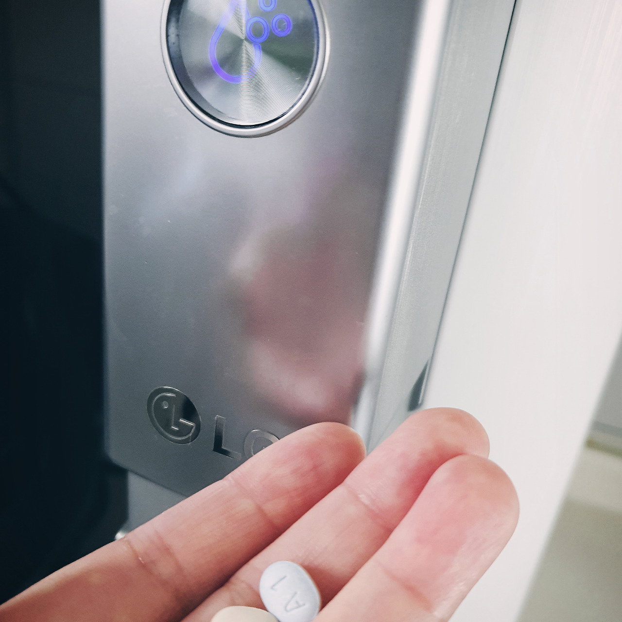 그리고는 120ml 용량의 정수를 출수해서 목구멍 속으로 콩알 크기만 한 약 한 알과 삼켜 낸다.