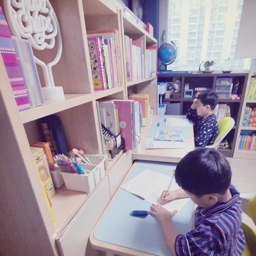 책상과 침대를 두는 방으로 남자아이 둘이 아슬아슬하게 함께 지내고 있었다.