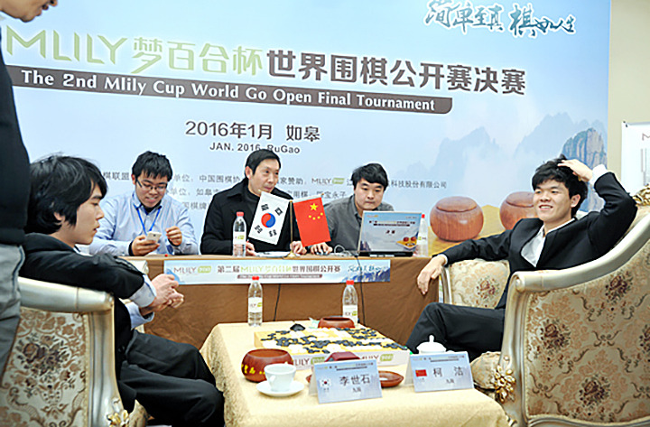 ▲박정환-리웨이칭 대국과 같은 상황은 처음이 아니다. 초대 몽백합배 결승5번기 이세돌(왼쪽)과 커제 대결 최종국에서 똑같은 상황이 연출됐다. 공배를 메우며 패를 버텨 반집 역전승한 커제가 환하게 웃는 반면, 이세돌은 허탈한 표정이다.