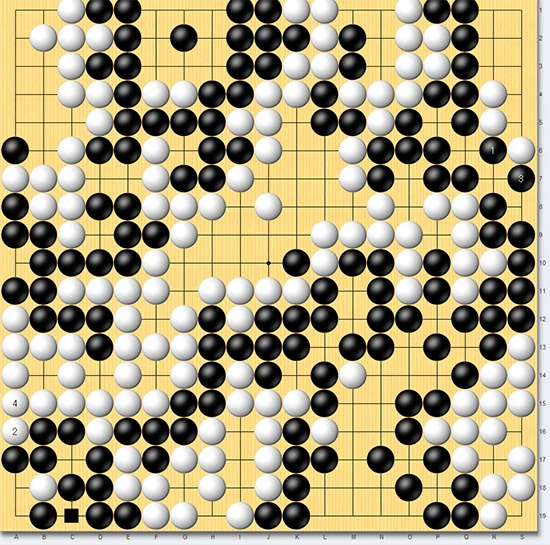 ▲하지만 리웨이칭이 흑1로 한 점을 따내서 응수하자 한국 중계진에선 "실수가 나왔다"는 환호가 터져나왔다. 추후에 이곳을 되따내는 패를 또 쓸 수 있기 때문에 우상귀에서 팻감이 1개 더 발생하게 생긴 것. 그렇다면 역전인가, 싶은 장면에서 리웨이칭은 흑3으로 시원스레 한 번 더 가일수를 하며 4의 곳 1집짜리 패를 양보했다. 모두가 의아해 하고 있을 때-