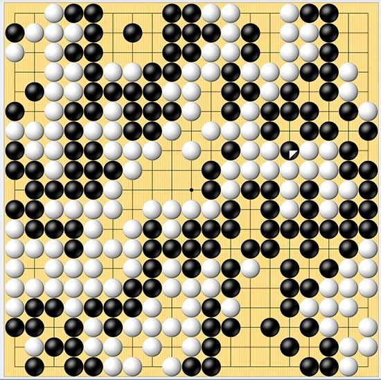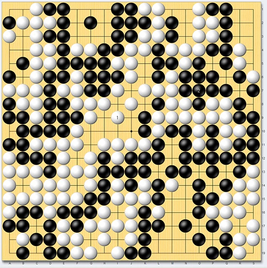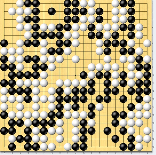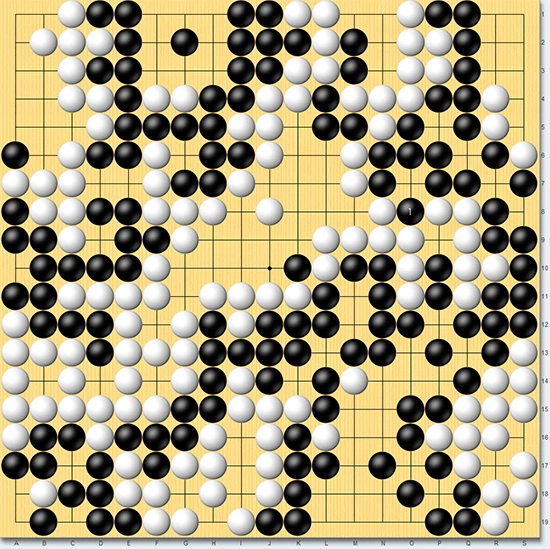 정말 그럴지 한 번 살펴보자. 우선 집부터 살펴보면, 기존 58집에서 사석 12개를 뺀 나머지이므로, 백집은 46집이다. 흑에게 잡힌 돌을 제외하고, 반상에 살아 있는 백돌은 130개. 더하면 176이다. 176과 ¾ 이상이어야(즉 177집을 만들어야) 승리할 수 있는 백은 딱 한 걸음이 모자랐다. 백이 만든 총합(집+생존한 돌 갯수) 176과 흑 총합 185를 더하면, 그게 바로 바둑판을 상징하는 숫자 361이다.