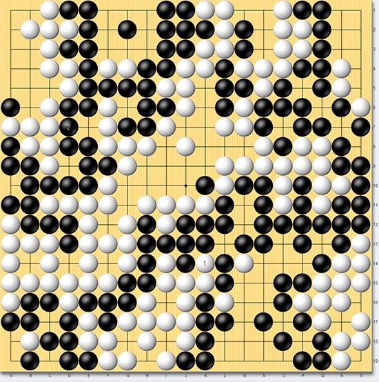 ▲이후에는 한국룰 관점에서 보면 황당한 수순이 끊임없이 전개되는데, 팻감이 부족한 박정환이 백1로 공배를 메우자 리웨이칭은 패를 해소하지 않고 마찬가지로 흑2로 공배를 같이 메웠다.