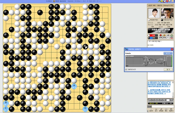 ▲먼저 살펴볼 장면은 종국 당시 상황이다. 고사양 카타고가 분석을 담당하고 있는 타이젬 인공지능 승률 분석에서조차 종국 시점에서 백 승률이 90%를 넘는다. 하지만 대국실 클라이언트 상단 결과엔 명백하게 '흑 반집승'이라는 결과가 나왔다. 왜 이런 상황이 발생했을까?