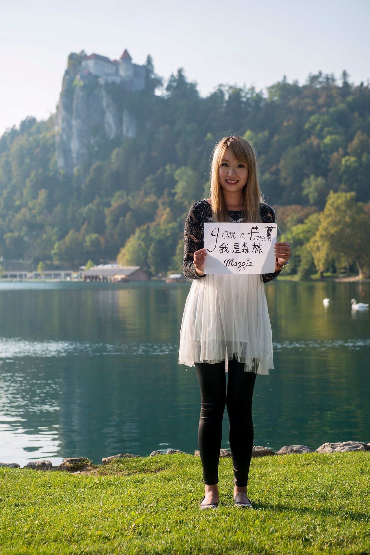 버스 안의 수다가 속도 방지턱 위로 튀어 오르길 반복하는 사이 익숙한 풍경들이 시야로 들어오기 시작했다. 블레드였다. 버스에서 내려 시계를 보니 류블랴나행 버스의 출발 시각이 임박한 상황. 촬영을 서둘러야 했다. 작업 장소로 정한 호숫가를 향해 허겁지겁 발을 놀리는 내 뒤를 메기가 힘찬 걸음으로 따라왔다. 내가 촬영을 준비하는 동안 메기는 그루터기 위에 종이를 올려놓고 정성스럽게 자필 메시지를 적었다. 쪼그리고 앉은 자세가 불편했을 텐데도 그런 내색 없이 정성껏 글자를 새겨 넣는 그녀의 뒷모습이 아름다워 보였다. 기내에서 승객들에게 보여주어야 하는 빈틈없이 깔끔한 모습과는 정반대의 면모이기에 더욱 보기 좋았다. 내가 그녀를 향해 셔터를 누르는 동안 화사한 오후 햇살이 그녀를 따뜻하게 감쌌다. 며칠 후 메기는 자신의 SNS 계정에 후일담을 올렸다. 격려의 기운이 나를 따뜻하게 감쌌다.