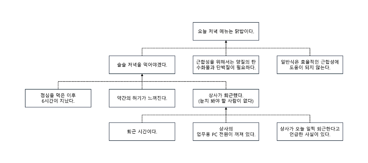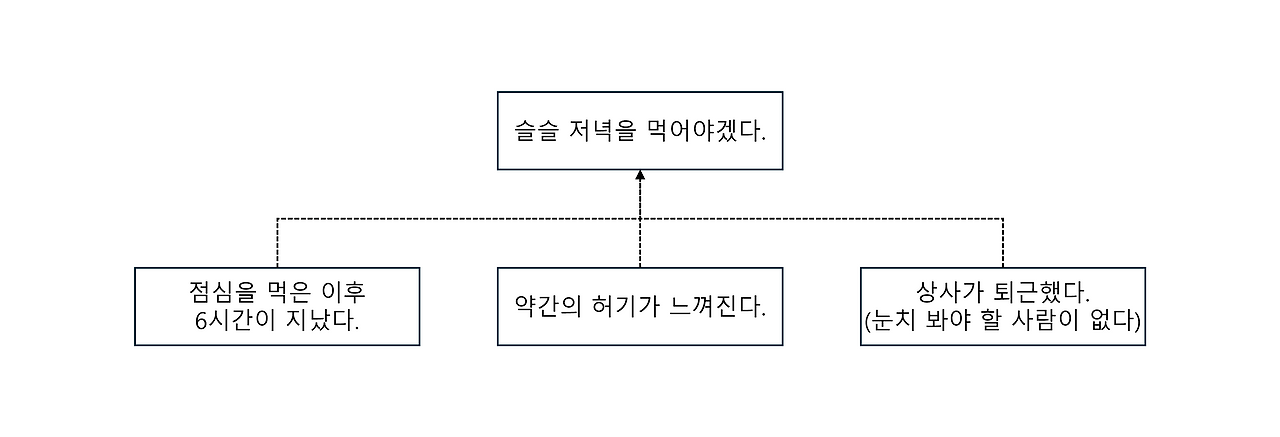 여기서 "슬슬 저녁을 먹어야겠다"는 생각은 해당 피라미드의 최상단 즉, 핵심 생각이다. 그리고 나머지 생각들은 핵심 생각을 뒷받침하는 보조 생각이다. A는 뜬금없이 핵심 생각을 떠올린 것이 아니라, 다른 보조 생각들이 수평적으로 모인 결과 저녁을 먹어야겠다는 결론에 이르게 된 것이다.