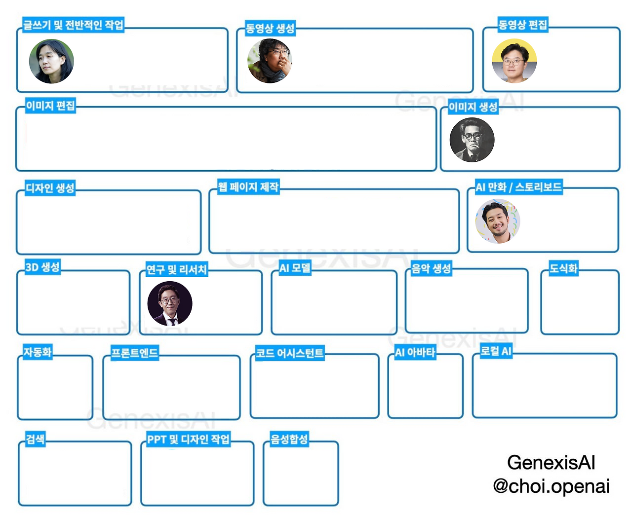 이 표를 보고 있노라면, AI 서비스들이 놓인 자리를 각 영역의 대가들로 채워 넣어도 이상하지 않을 것 같다.