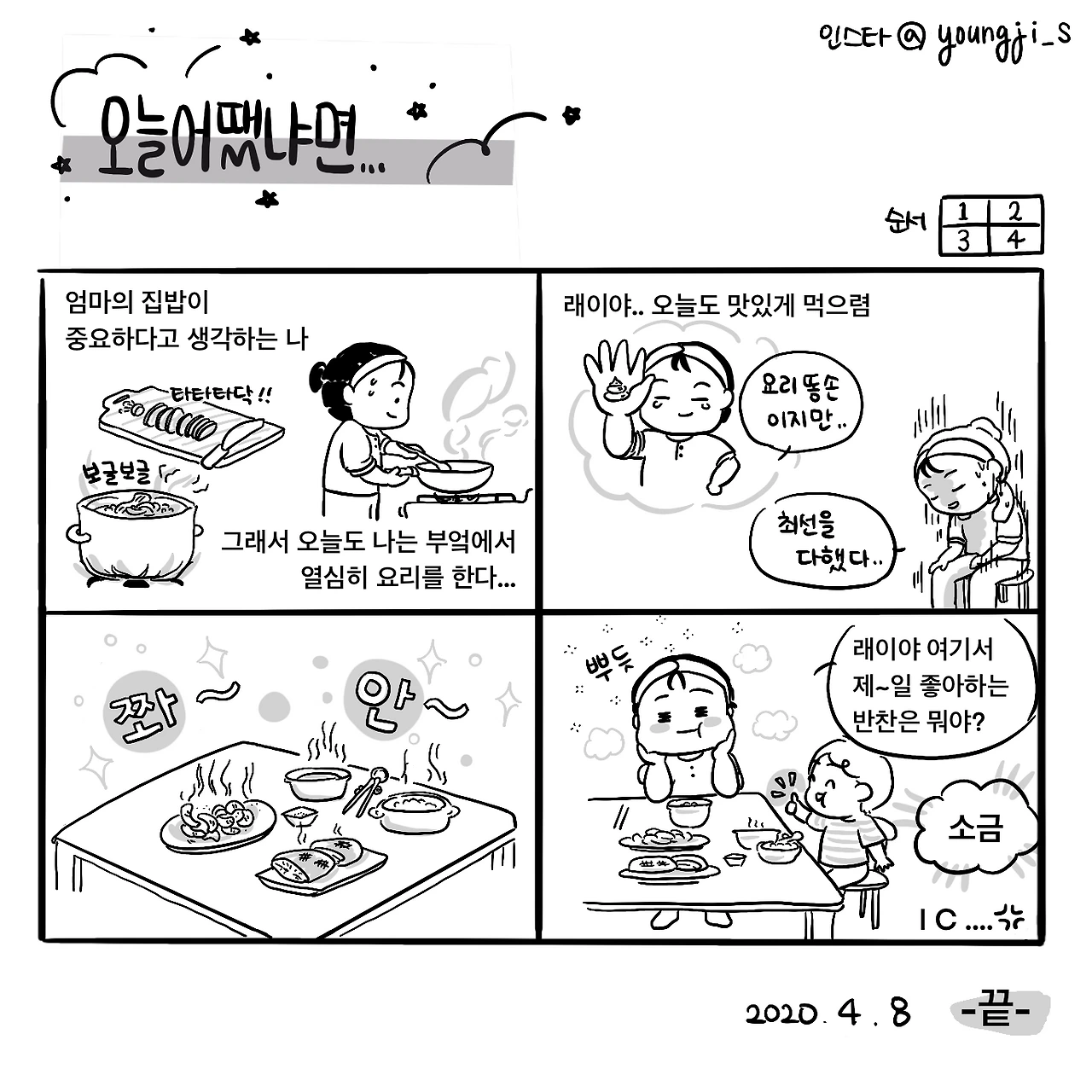 오늘 어땠냐묜....내일은 또 뭐 해 먹이고, 뭐하며 놀까요?점점 밤에 느끼는 피로가 무거워져요..#korean #corona #comic #인스타툰 #코로나 #봄 #food #집밥 #맘스타그램 #육아 #유아식 #맛집 #우리집
