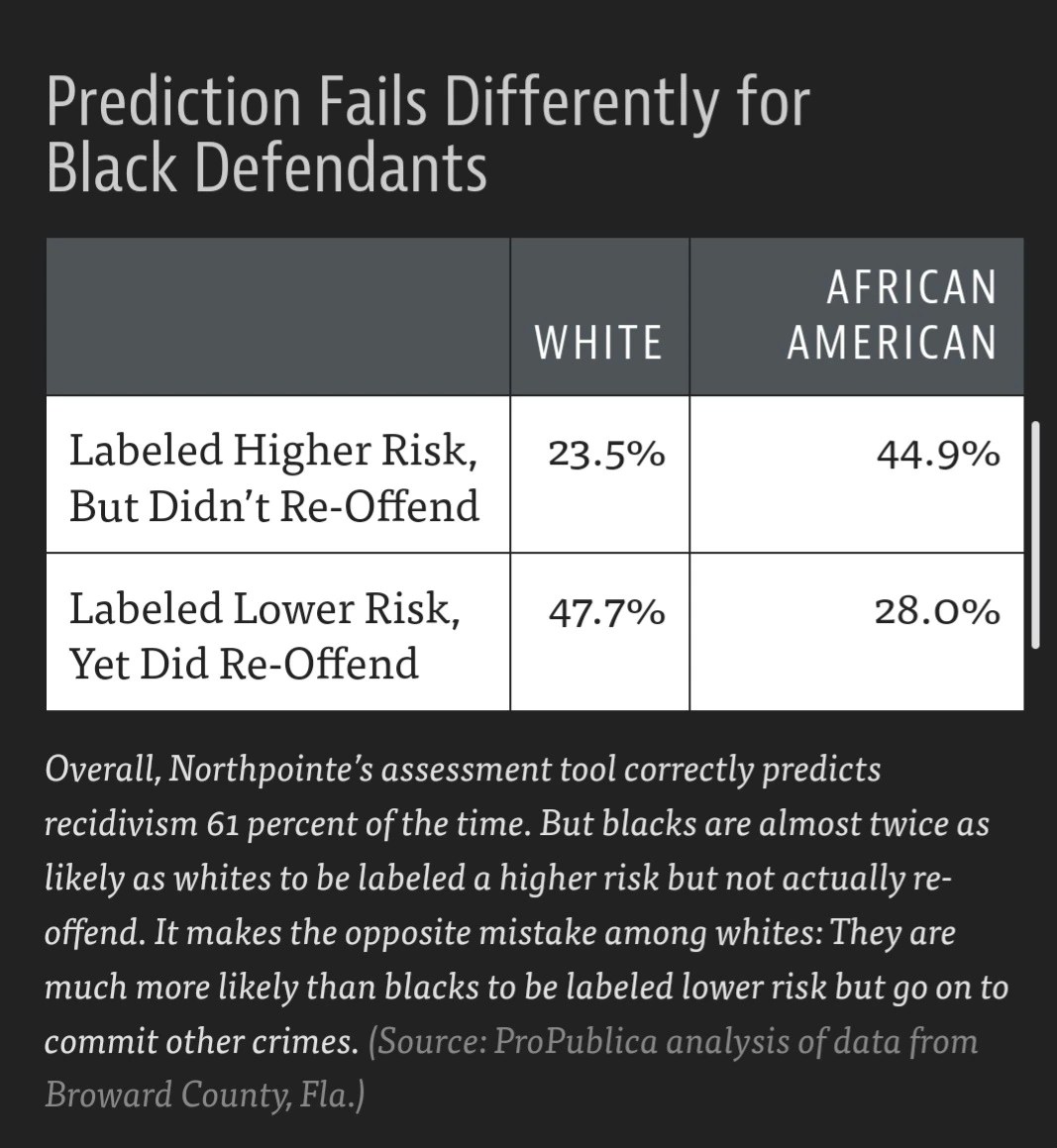 2016년, 미국 법원에서 사용하던 재범 예측 시스템 COMPAS가 충격적인 결과를 보였다. 동일한 범죄 이력을 가진 백인과 흑인을 비교했을 때, 흑인이 '고위험군'으로 분류될 확률이 두 배 높았다. 실제로는 재범하지 않은 흑인의 45%가 고위험으로 잘못 분류된 반면, 백인은 23%에 그쳤다.