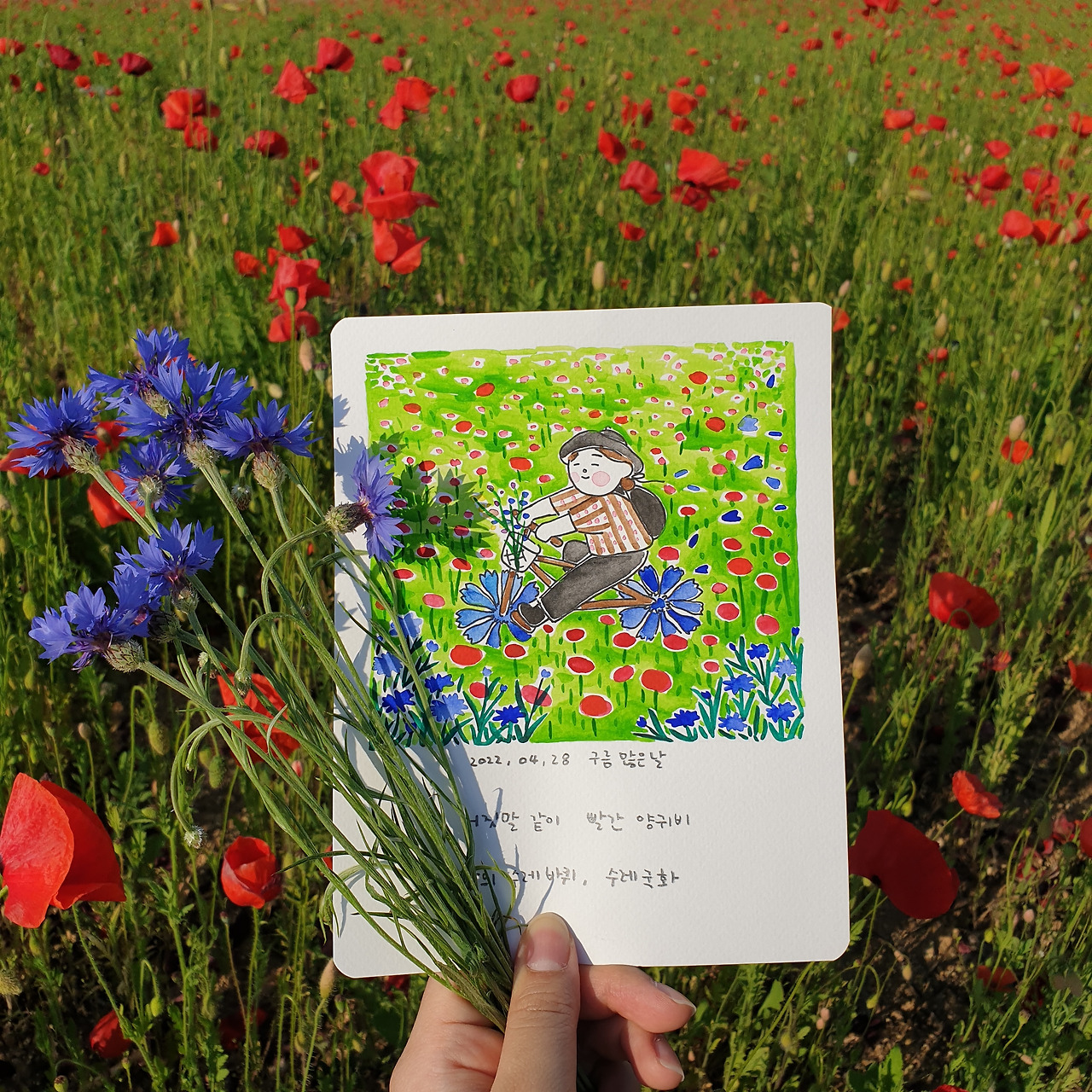 거짓말 같이 빨간 양귀비 꽃밭에 다가가기 위해 자전거를 타고 전에 가지 않던 길로 가고 있었다. 사람의 발걸음이 드문 길가엔 강가에서 날아와 뿌리를 내린 수레국화가 피어있었다. 신비한 푸른빛. 수레바퀴를 닮아 수레국화라 이름 붙여진 꽃을 들여다보고 있자니 대학교에 잔뜩 피어있던 수레국화밭이 생각났다.