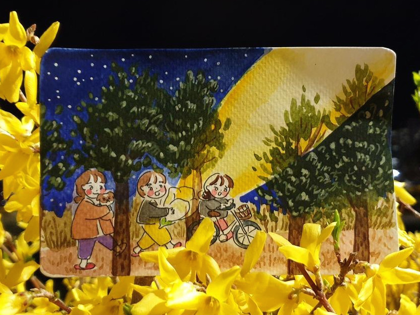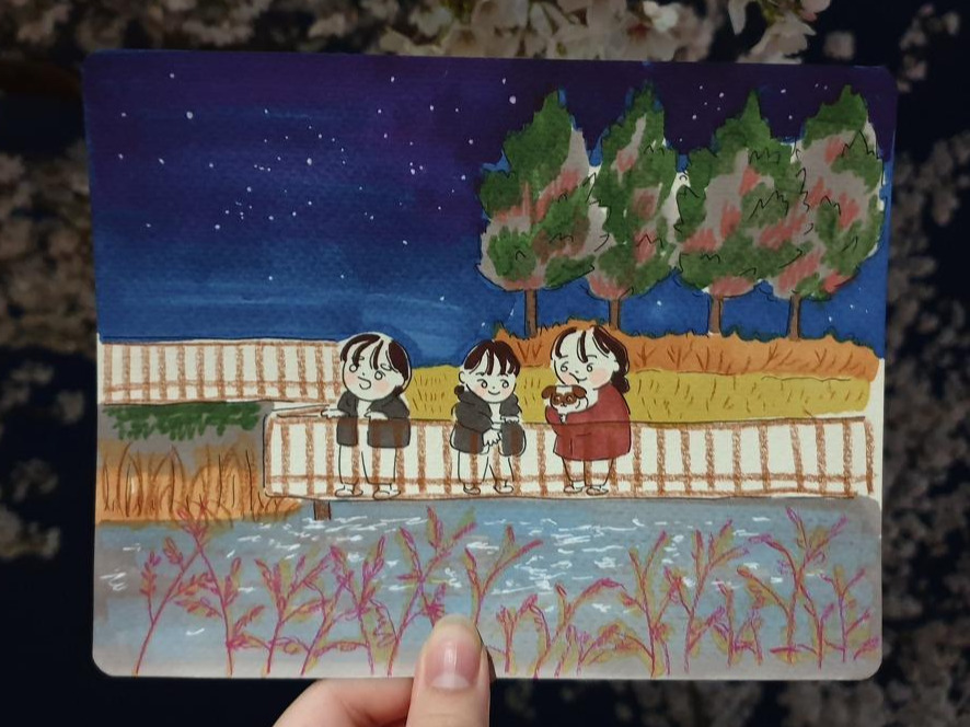 그렇게 우리 의 심야 산책은 세 명이서 가게 되었다. 귀염둥이 똥꾸까지. 자전거를 끌고 머리에 스칠듯한 나무를 지나 연못을 향하는 길에 만난 목련은 까만 밤하늘을 밝히는 전구같이 환하게 피어있었다. 그렇게 도착한 연못에서 처음엔 무서워서 빨리 걸음을 재촉했지만 왠지 세 명이서 있으니 스산했던 곳이 즐거운 곳이 되어 벤치에 앉아 별을 보기까지 하였다. 오랜만에 바라본 밤하늘엔 언제나 그 자리에 있었다는 듯이 별이 반짝이고 있었다. 각자의 사색을 마친 후 우리는 집으로 돌아왔다. 짧은 심야 산책이었지만 오래도록 기억에 남을 것만 같은 우리들의 모험 일기였다.