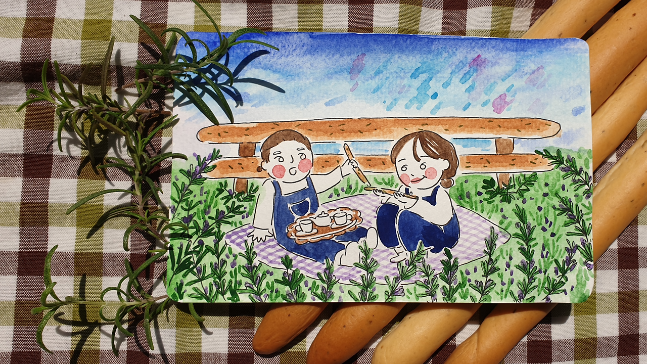 길쭉한 그리시니로 만든 울타리와 로즈메리 숲, 그 속에서의 피크닉 그리시니를 챙겨 들고 로즈메리 숲으로의 피크닉을 가는 건 어떨까. 나는 극 호.