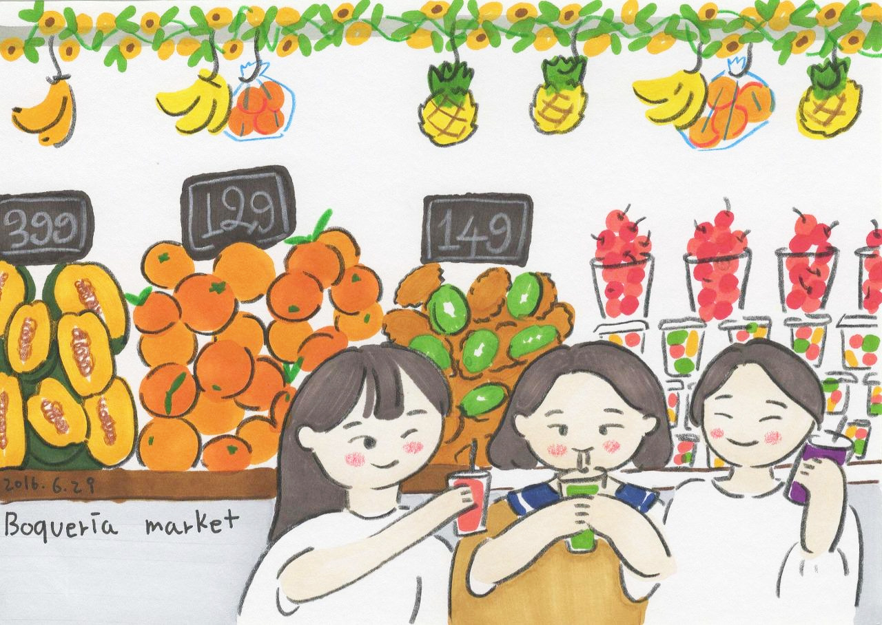 다음으로 발을 돌린 곳은 보케리아 시장. 싱싱한 과일이 잔뜩 있고 우리는 색색의 과일로 만든 주스를 한잔씩 들었다. 과일 옆에는 과일을 닮은 알록달록한 젤리가 한가득. 다채로운 색이 가득한 시장이었다. 바르셀로나 에 왔으니 호안 미로 미술관도 가보고 싶었지만 혼자 온 여행이 아니기 때문에 아쉽지만 다음 기회에. 대신 내일은 달리 미술관에 간다.