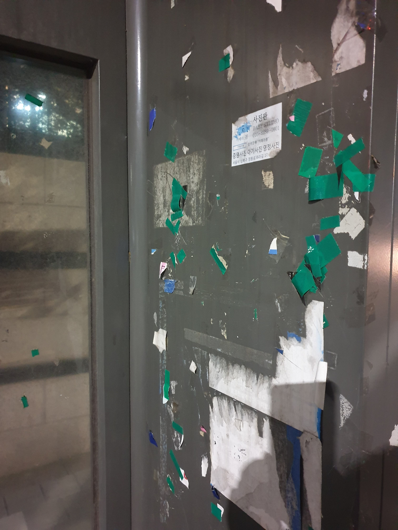 테이핑과 함께 놓여 있는 건 '100% 수익 부동산' 쪽지 광고, 할머니가 지나간지 30초도 안되어 건장한 아저씨가 가방을 한쪽에 둘러매고 흰색 쪽지옆에 순식간에 광고쪽지를 붙여 댄다