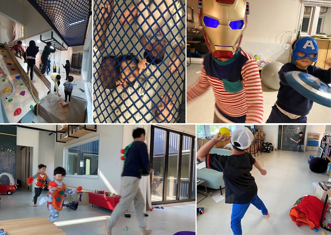 그러다 중정 트랙을 따라 뱅뱅 돌며 뛰고, 잡고, 숨바꼭질한다. 캐릭터 마스크를 쓰고 나무칼을 휘두르며 히어로가 되기도 하고, 치열한 너프건 전투에 참여하기도 한다. 진지함에 웃음이 난다.