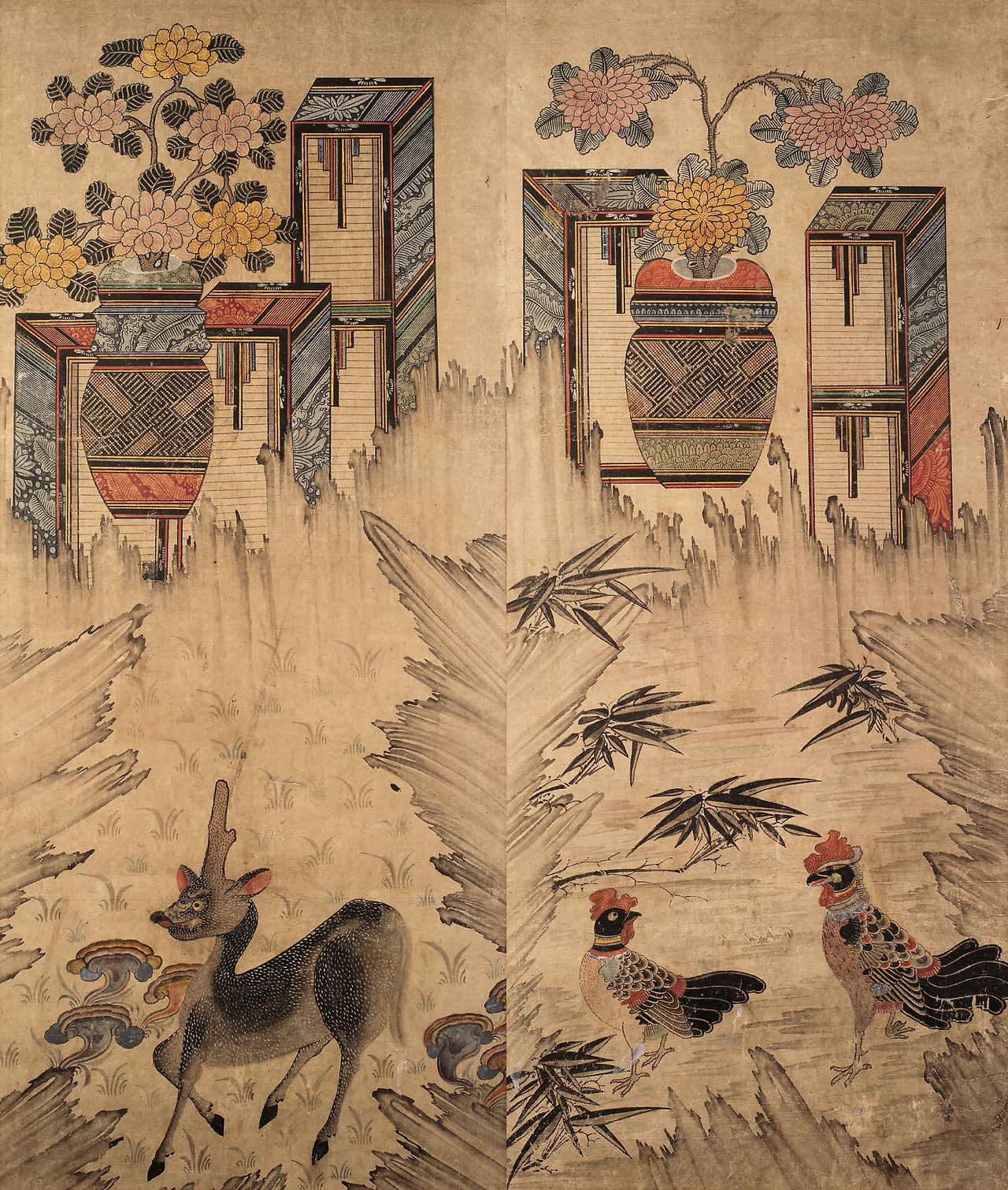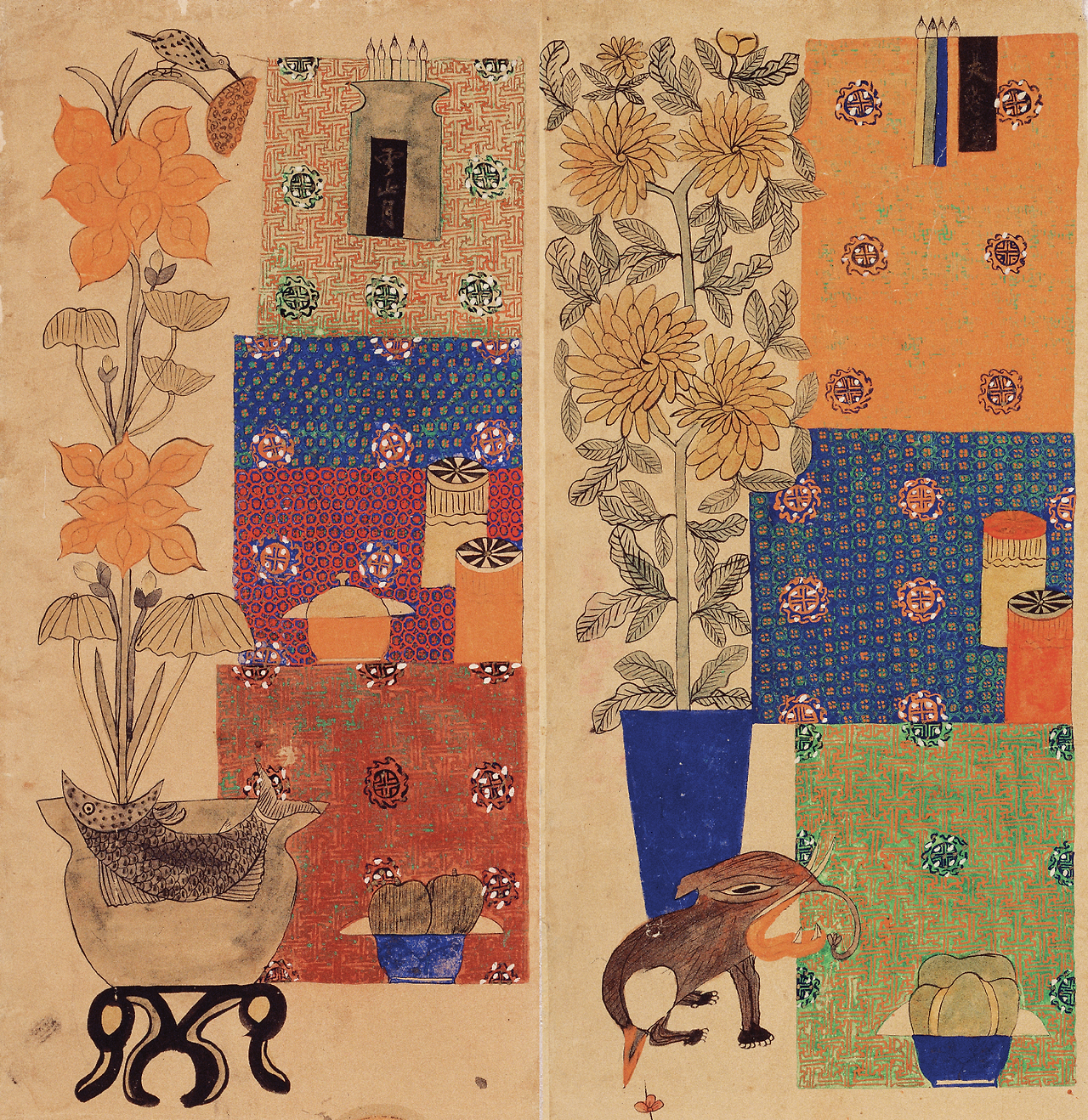 <책거리와 서수>, 4폭 중 1, 3폭, 19세기, 종이에 채색, 각 110×43cm, 프랑스 기메동양박물관.