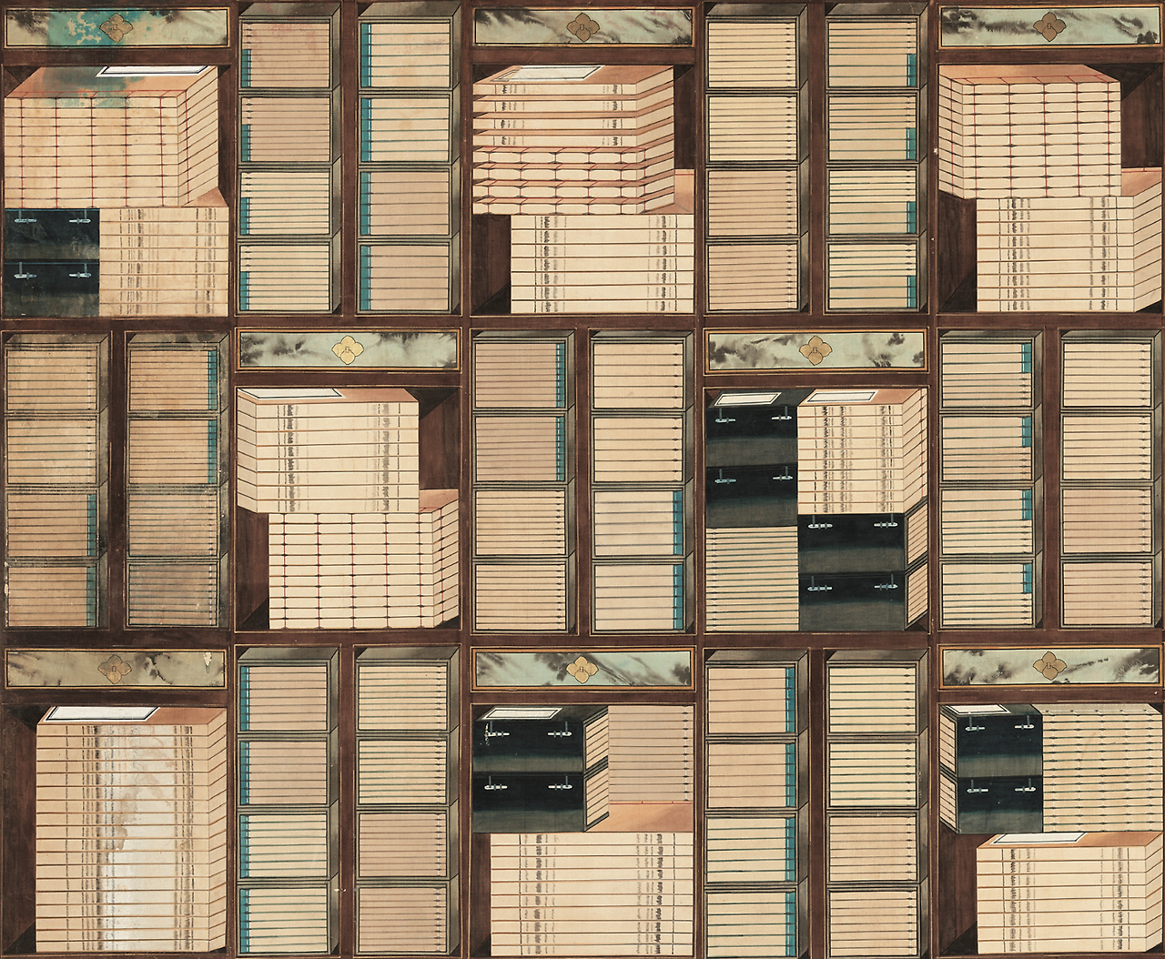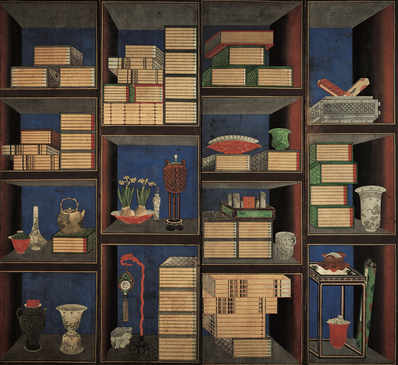 <책가도>, 10폭 병풍 중 3~6폭, 19세기, 비단에 채색, 143×384cm, 개인소장.