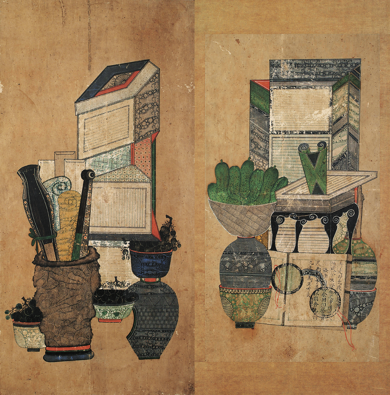 <책거리>, 2폭, 19세기, 종이에 채색, 각 64×31.9cm, 52.8x28cm, 일본민예관.