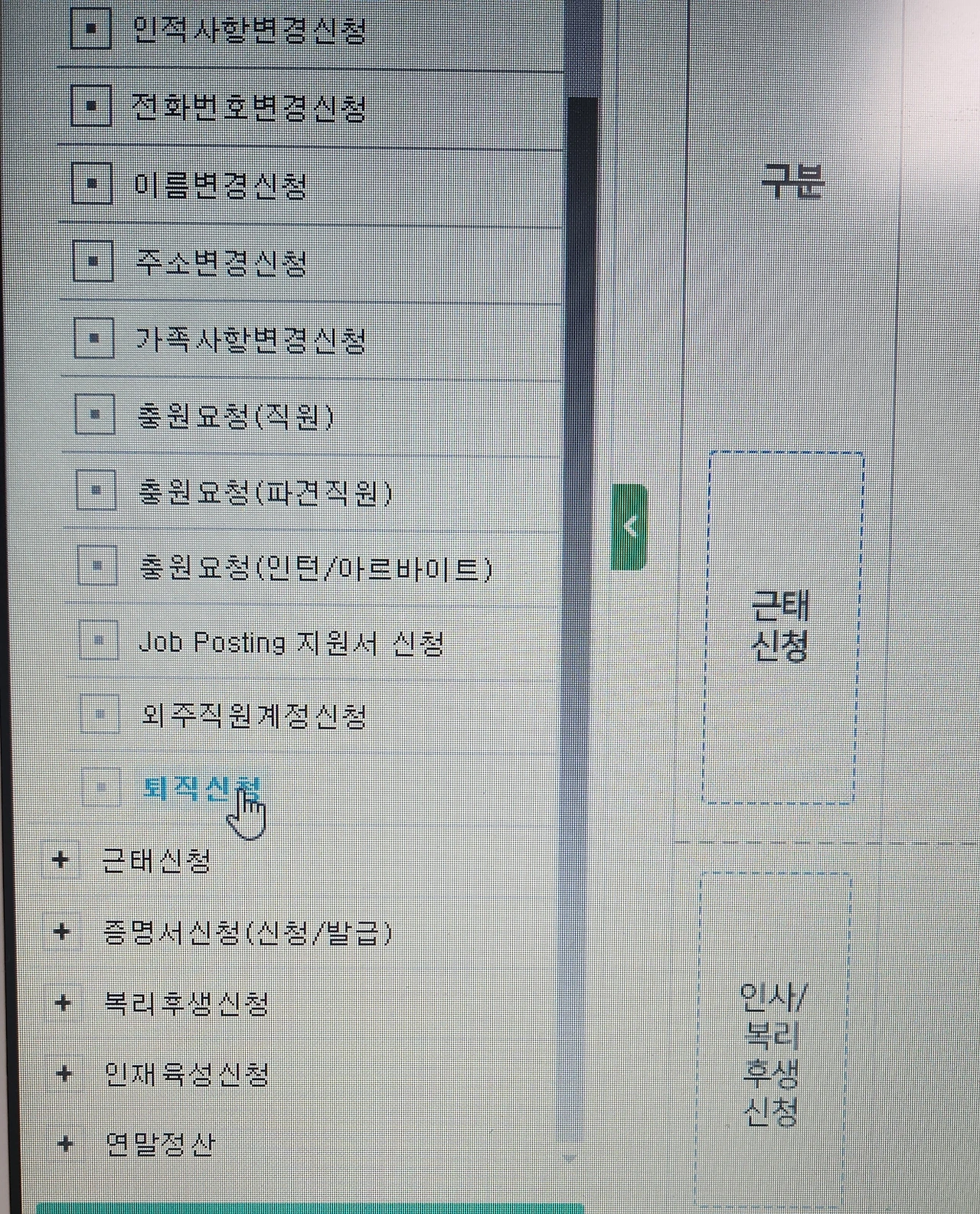 인사담당자는, 굳이 회사에 나오지 않고 인터넷으로 퇴직신청서를 작성할 수 있도록 조처를 해주었고, 아 이제 정말 마지막이구나, 싶은 심정으로 사이트에 접속했다. 평소라면 활성화되지 않았을 '퇴직신청' 메뉴에 접근이 되던 순간.