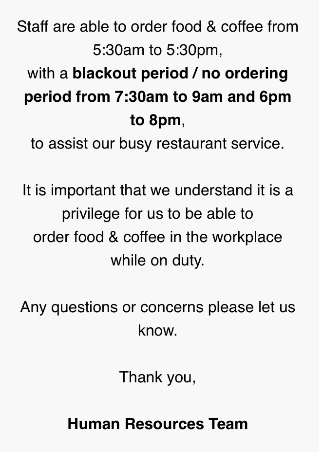 우리 호텔의 직원복지 중에 하나는 직원들이 쉬는 시간에 호텔 레스토랑에서 음식을 주문해서 먹을 수가 있다는 것이다. 50% 직원 할인까지 받을 수 있지만 고객과 셰프들의 편의를 위해 바쁜 시간을 제외한 시간에 애플리케이션으로 제한된 음식만 주문을 할 수가 있다.