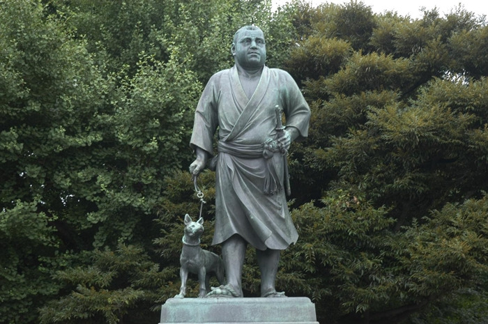 도쿄 우에노 공원 입구에 우뚝 서 있는 동상, 사이고 다카모리다. 소박한 옷차림에 종아리를 드러내고 사츠마(가고시마) 견을 끌고 토끼 사냥하러 가는 촌사람의 모습.