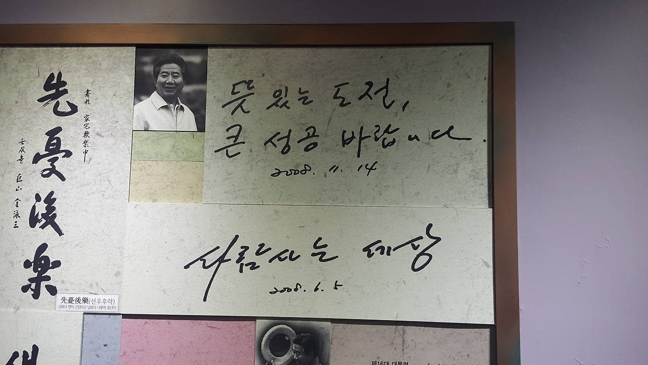 한편 꼭 드리고 싶었던 질문은 "왜 그러셨어요?"였다. 역사는 현재와 과거와의 끊임없는 대화라고 한다. 그런데 현재의 질문에 답해주는 과거는 없다. 그래서 동일 인물과 같은 사건에 대한 현재의 평가와 해석이 다양한 것인가? 이런저런 생각을 하며 역대 지도자들의 흔적들을 보다 노무현 대통령께서 쓰셨다는 글귀에 발걸음이 멈췄다. "사람 사는 세상" 흔히 듣고 자주 쓰는 표현이다. 그런데 노무현이라는 존재 때문인지, 그분의 정치인생 때문인지는 잘 모르겠으나 나에게는 깊은 잔상을 남겼다.