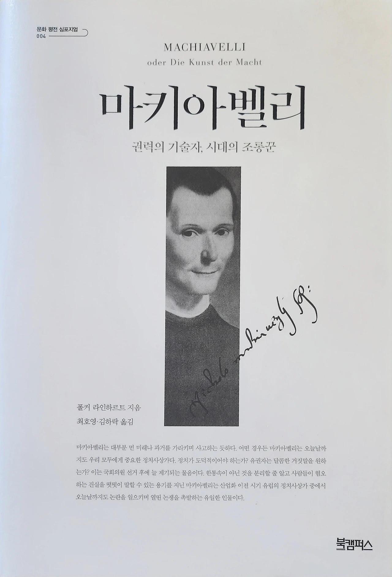 저자인 폴커 라인하르트(Volker Reinhardt, 1954~)는 이탈리아 르네상스에 관한 세계적 권위자로 알려져 있다. 폴커 교수님은 마키아벨리의 도발적인 모습에 초점을 두고 권력의 기술자이면서 시대의 상식을 조롱한 인물로 묘사하고 있다. 그러나, 마키아벨리는 불편한 진실을 말할 수 있는 떳떳한 용기를 지녔고, 몰락한 이탈리아의 역사를 새롭게 설계하여 찬란한 미래를 만들어가고자 했던 인물이기도 하다.