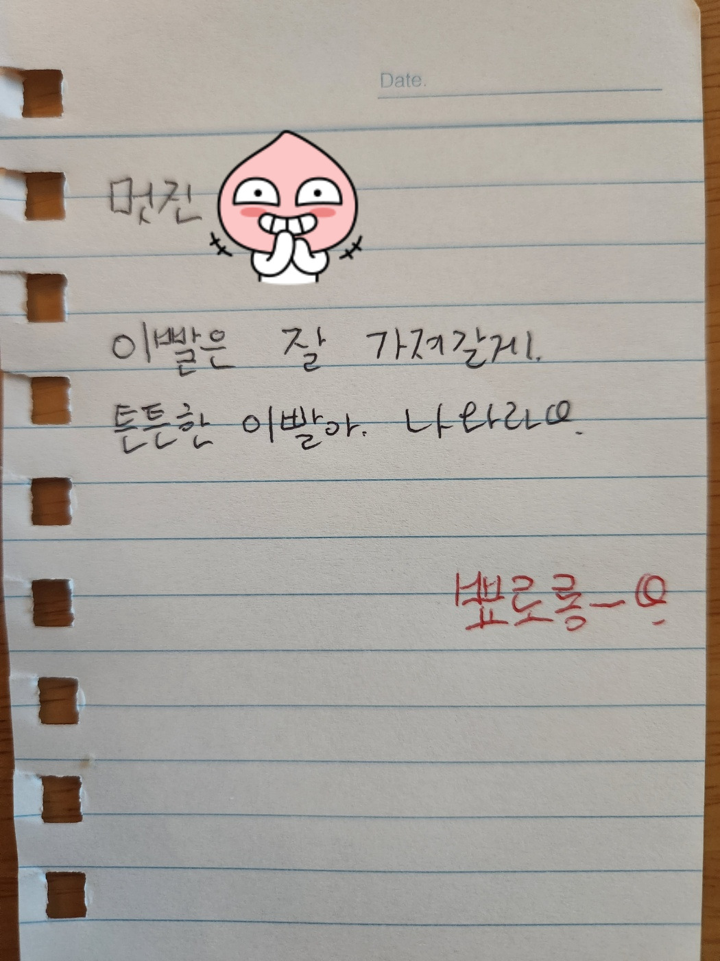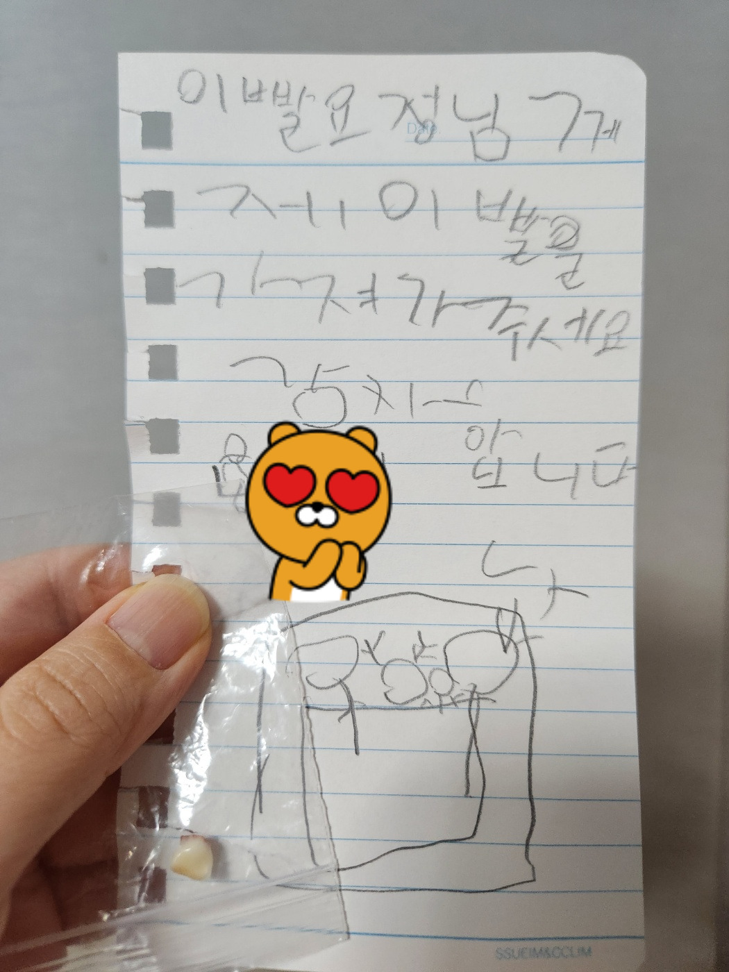 고심끝에 이빨요정의 역할을 자청하고 편지를 남겼다. 이빨은 안전한 장소에 고이 숨겨뒀다. 선물이나 돈은 우리집 이빨요정이 허락하지 않는단다.