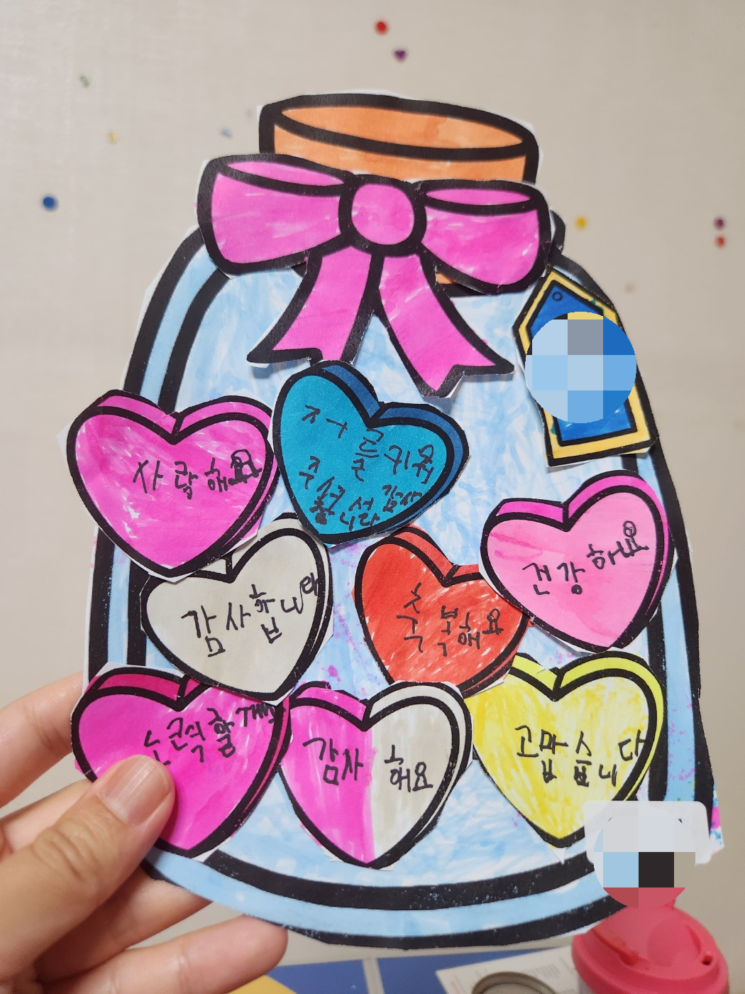 대단이가 부스럭부스럭 책가방에서 뭔가를 꺼내 준다. 유리 단지 그림을 색칠하고 단지를 주고 싶은 대상에게 하고 싶은 말을 하트모양 종이에 써서 붙여 놓은 작품이다.