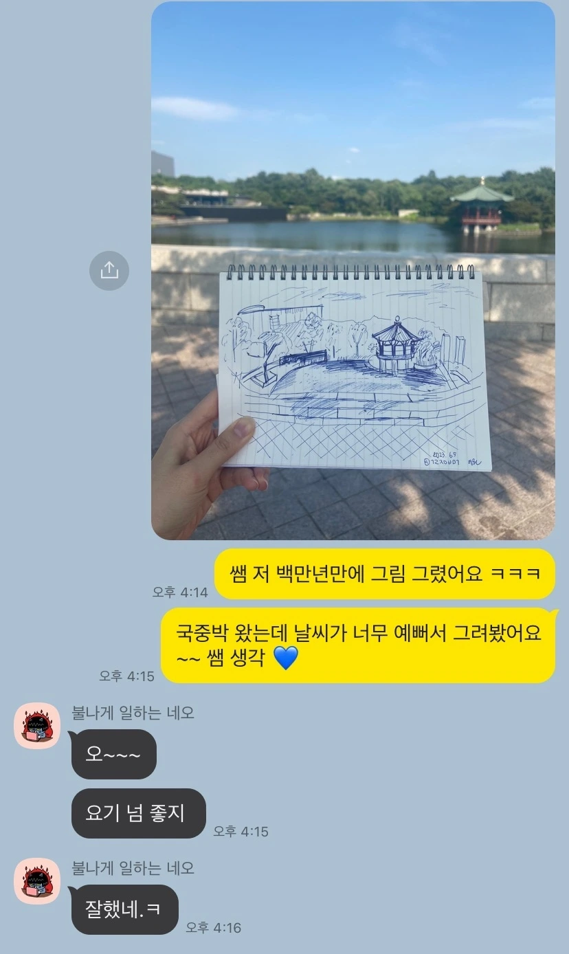 그 후로 놀라우리만치 그림을 그릴 일이 없었다. 무언가를 그리고 싶다는 욕구가 든 적이 딱히 없는데, 오늘의 이 약간 뜨거운 햇빛과 파란 하늘, 고요한 물결과 윤슬, 정자의 모습은 차분히 풍경을 기록하고 싶다는 생각을 들게 했다. 사진으로 담는 것과의 차이는, 풍경을 하나하나 차곡차곡 눈에 담게 된다는 것. 당연히 잘 그리는 실력은 못되지만, 초중학교 시절 미술 학원을 꾸준히 다녀서인지 펜을 휘두르는 것에 두려움은 없었다. 그리다 보니 2년 정도 미술을 배우고는 친구 사이가 되어버린 나의 옛 미술 선생님이 생각나 사진을 찍어 보내드렸다.
