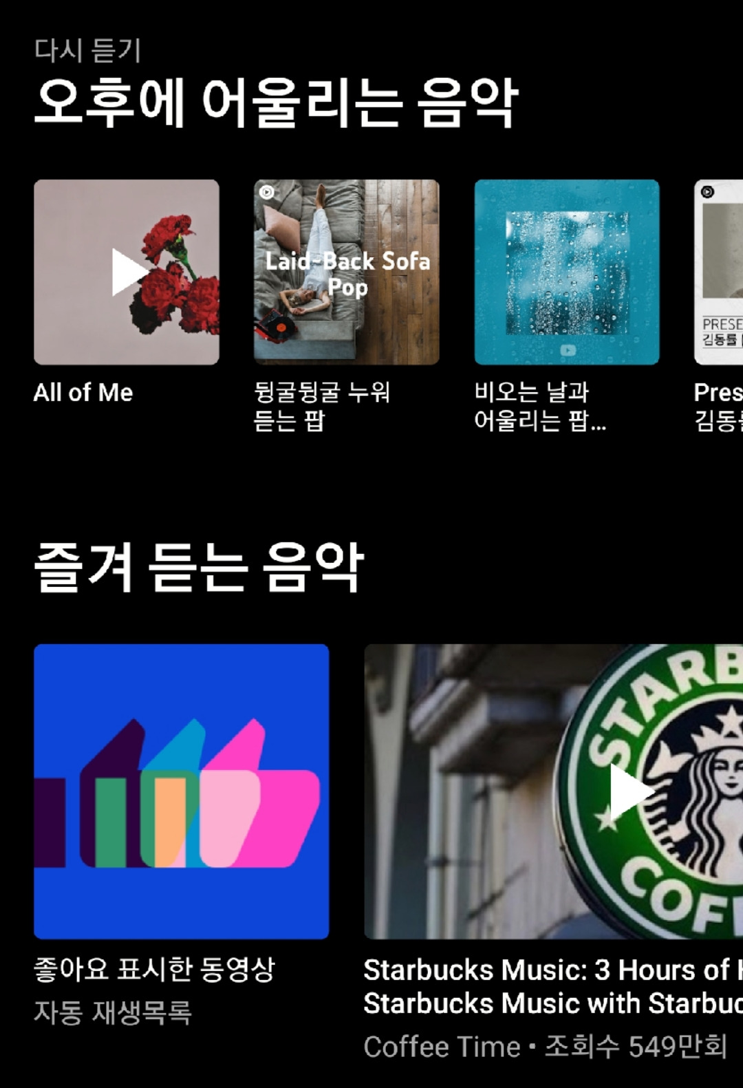 음악 스트리밍에 있어 이 '아무거나'를 잘해주는 서비스가 바로 유튜브 뮤직이다. 유튜브 뮤직 홈 화면에는 아래 그림에서와 같이 '오후에 어울리는 음악', '비 오는 날과 어울리는 팝 발라드', '구름 많은 날'과 같은 이름으로 추천 플레이리스트를 직관적이면서 감성적으로 보여준다. 사용자는 이중 어떤 것을 선택해야 하긴 하지만 매번 다음에 들을 노래를 생각해내거나 선곡하기 귀찮아 몇 년 전에 만들어 놓은 플레이리스트를 계속 반복해서 듣지 않아도 된다.